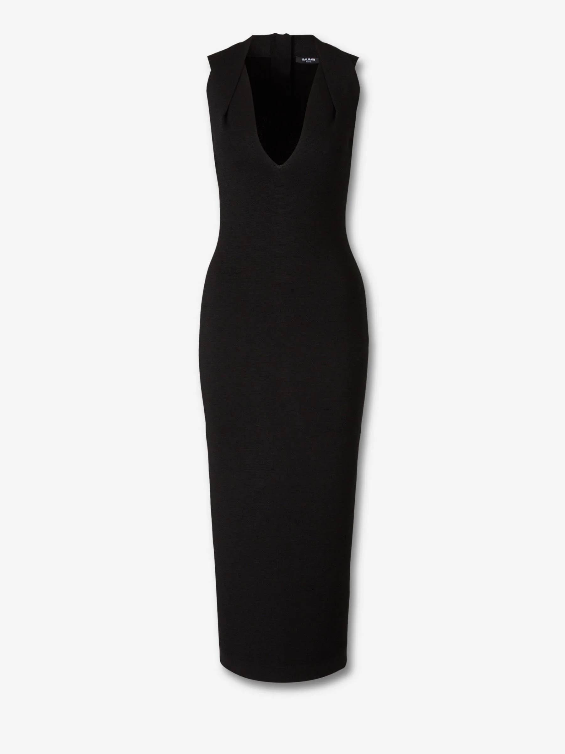 SKU: 732-001663 01 BRAND ID: GF1RJ210KJ43 Dress By Balmain • V-neck • Elegant design with subtle pleats • Fitted fit • Made from viscose and polyester knit • Midi dress • Back zip closure • Composition: 85% viscose, 15% polyester • Made in: Italy