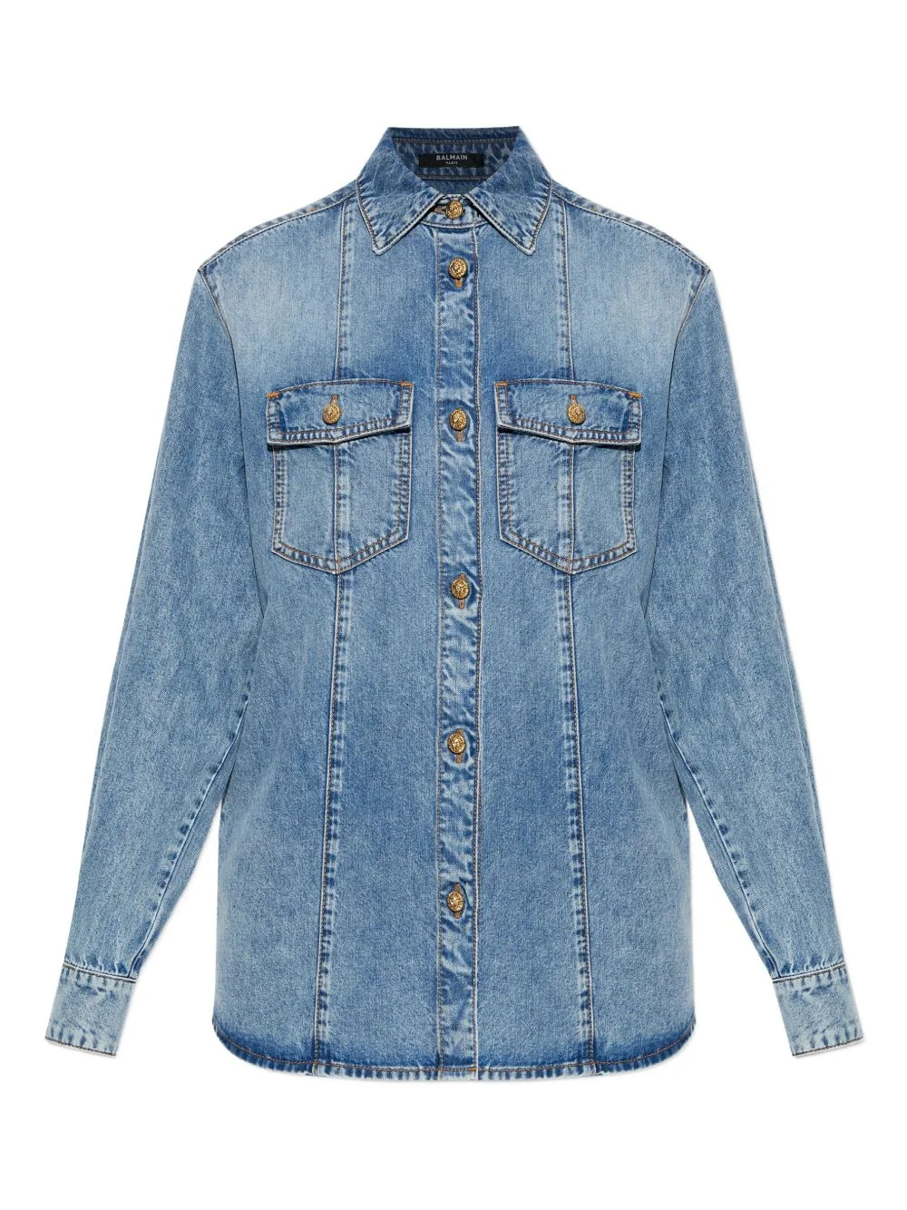 point-collar denim shirt Highlights - Light blue - Front button fastening - Two chest flap pockets - Buttoned cuffs - Point collar - Topstitching Made in Italy Composition Lyocell 100% Washing instructions Read Manufacturer Guidelines