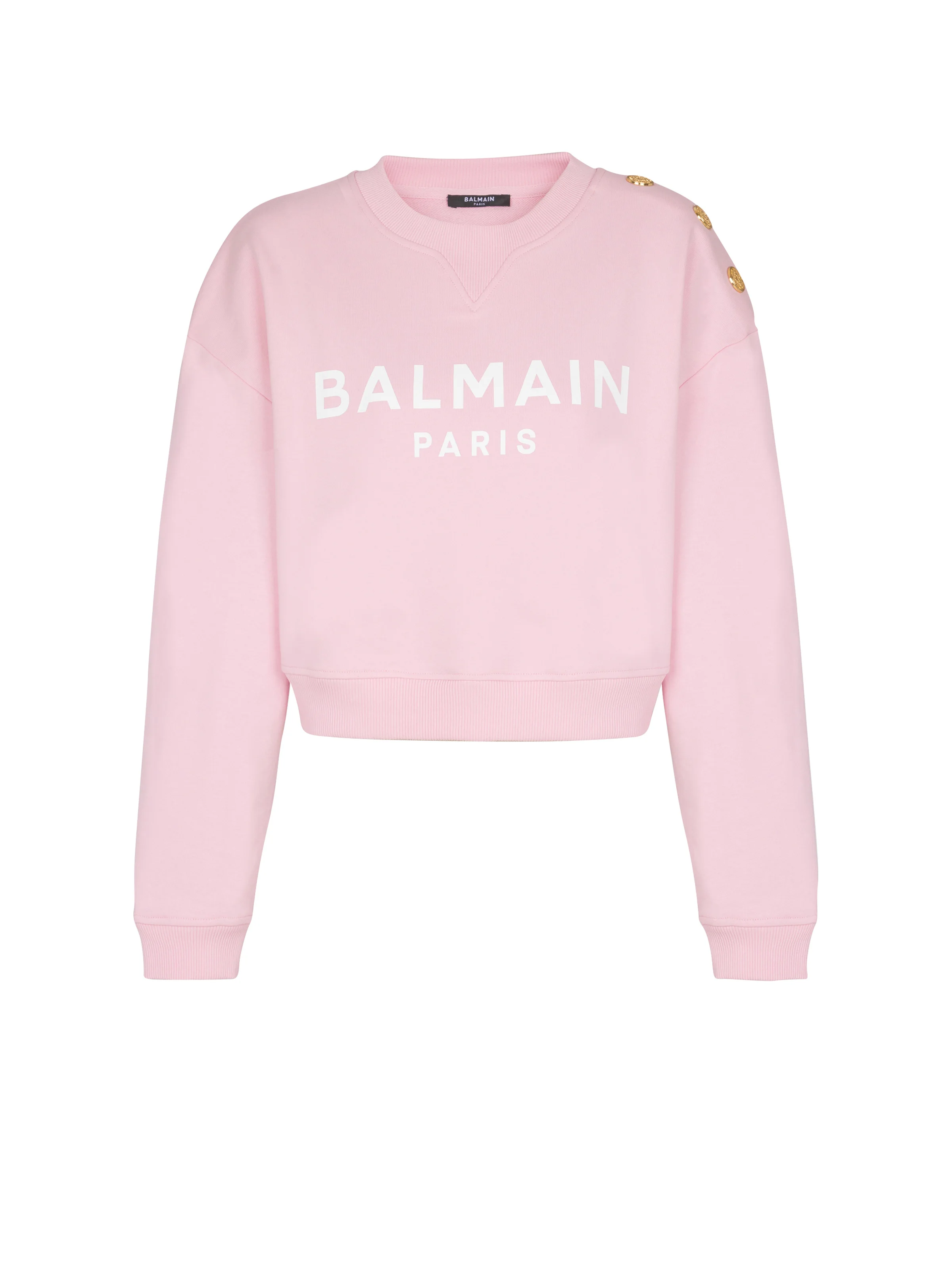 Printed Balmain Paris sweatshirt - Round neckline - 3 decorative embossed gold metal buttons on the shoulder - Long sleeves - Contrasting Balmain Paris logo printed on the front - Ribbed trim - Regular cropped cut - Model measures 179cm and wears a size S - Main material: 100% cotton - Made in Portugal - Item: EF1JQ002BB02100% of the cotton fibres used to make this garment are certified and organically farmed