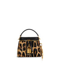 Pulse Vanity leopard print calfskin and ponyskin-style leather bag - Carry in the hand, on the shoulder or across the body - Leather handle - Adjustable buckled shoulder strap to remove using the stud button - PB-engraved metal side plaques - Fastening with double metal zip and knotted leather sliders - PB-engraved metal lock on the front - Golden Balmain Paris logo embossed on the front - Metal keyring with chain and removable snap hook key - Leather bag feet - Embossed leather inside card pocket - Canvas lining - Dimensions: 10.5 x 17 x 14.5 cm - Main material: 100% calfskin - Made in Italy - Item: FN1BH004LPOR