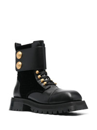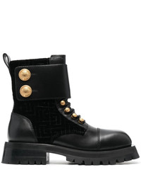 embossed-button detail ankle boots Balmain's military influences are clear in this pair of combat boots, defined by their lace-up fastening and chunky rubber sole. The house's signature embossed buttons add a refined branded touch. Made in Italy Composition Leather 100% SIZE & FIT Measurement HEEL 1.96 in(5 cm) HEIGHT 6.49 in(16.5 cm) Sole height 1.18 in(3 cm)
