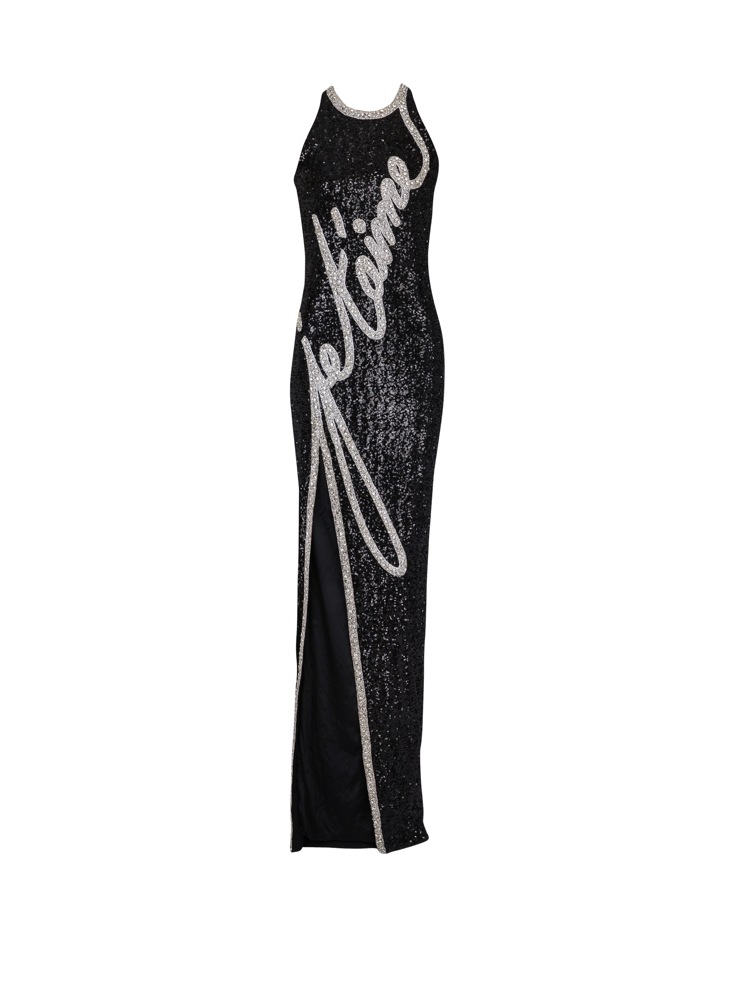 Sequin dress with "Love Letter" embroidery - Long, slim fit - Halter neckline - Sleeveless - "Love Letter" embroidery with beads and crystals - Front split - Visible metal zip fastening on the back with Balmain-engraved slider - Satin lining - Model measures 179cm and wears a size 36 - Main material: 100% polyester - Made in India - Item: EF1RO140PC70