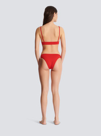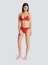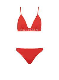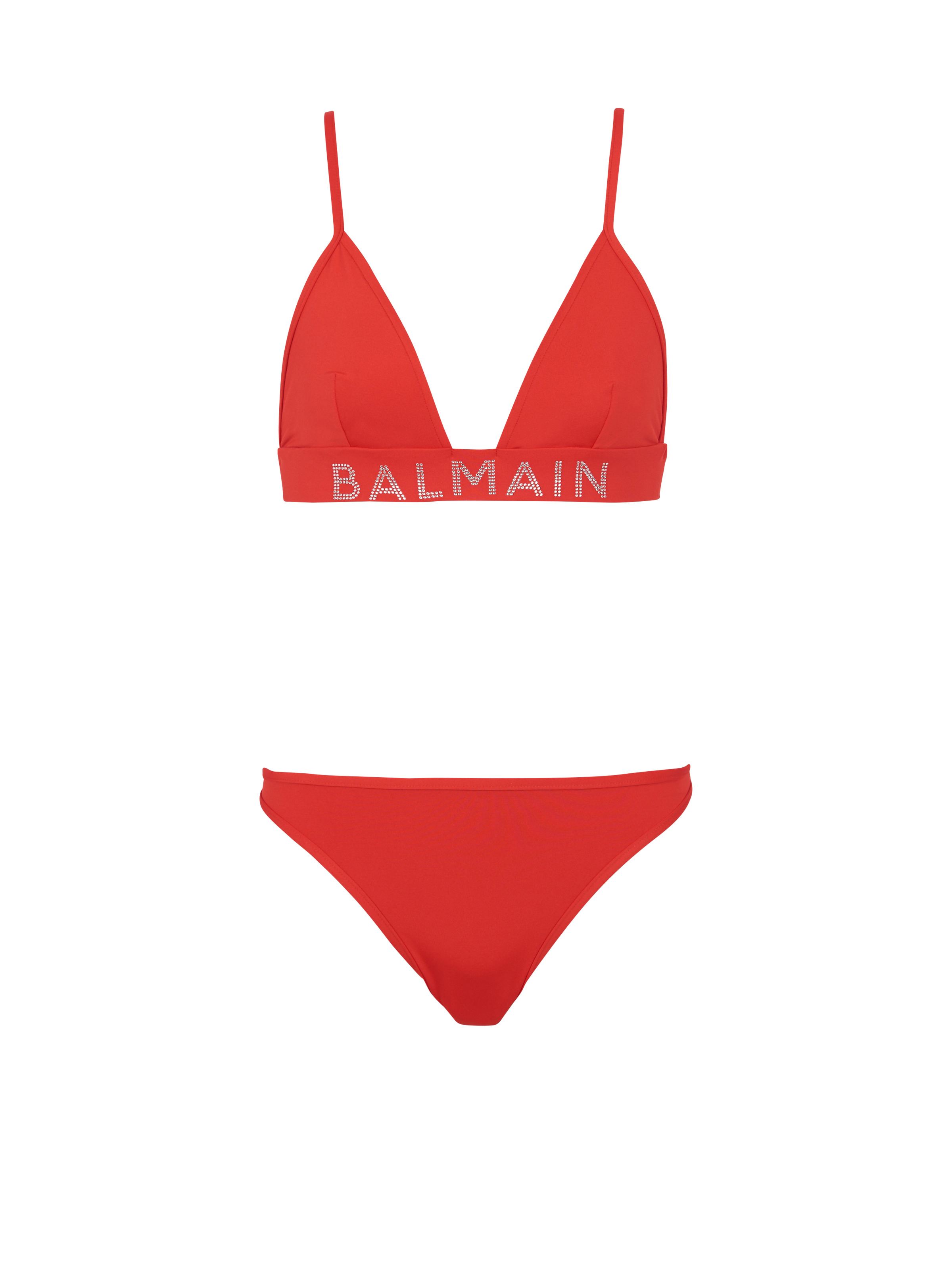 2-piece plain lycra swimsuit - Triangle bra top - Wide fabric-covered elastic band - Rhinestoned Balmain logo - High-cut briefs - Model measures 176 cm and wears a size 34 - Material: 84% polyester, 16% elastane - Made in Italy - Item: BKB80145