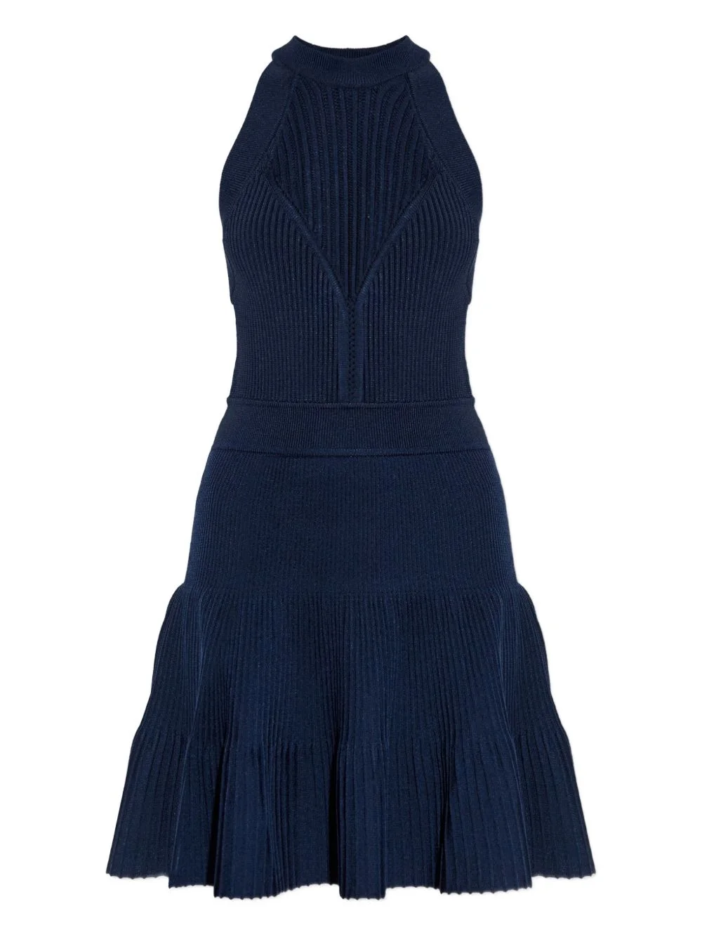 ribbed halter mini dress Highlights - Dark blue - Ribbed knit - Halter neck - Pleated skirt - Cutaway shoulders - Band detail Made in Italy Composition Viscose 84%, Elastane 16% Washing instructions Read Manufacturer Guidelines