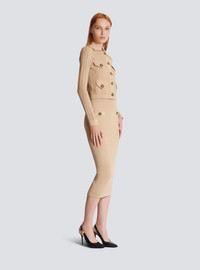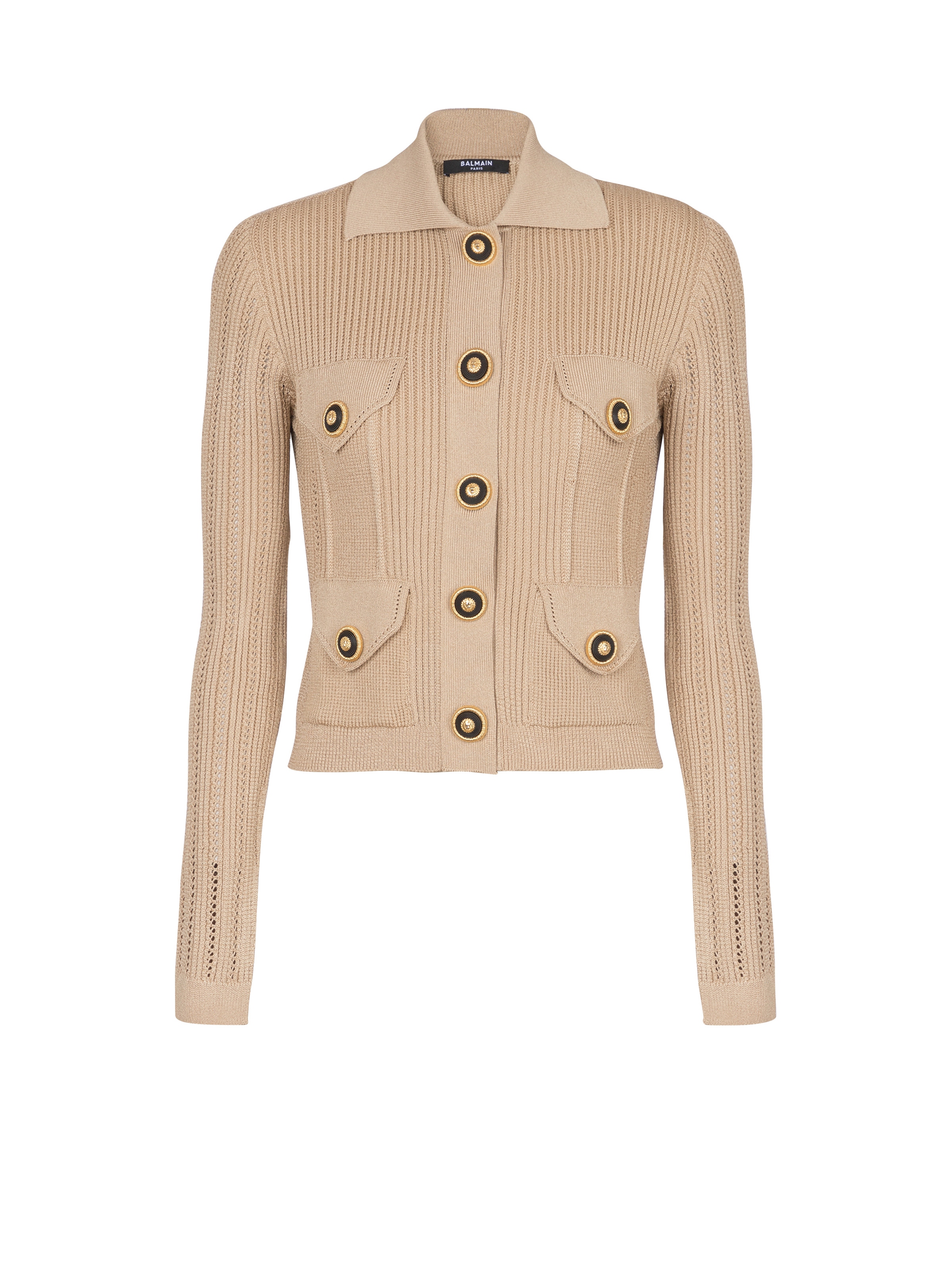 Ribbed openwork knit cardigan - Shirt collar - Long openwork knit sleeves - Fastening with 5 press studs - 2 chest pockets with fake flaps - 2 patch pockets with press-stud flaps - "Chain Lion Thread" buttons in two-tone metal - Openwork Balmain Signature logo on the back - Ribbed trim - Cropped slim fit - Model measures 181cm and wears a size 36 - Main material: 84% viscose 16% polyester - Made in Italy - Item: EF1KL150KI10100% of the viscose fibres used to make this garment come from certified, sustainably managed forests