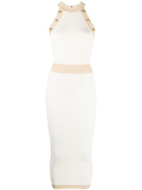 button-detail knitted dress Balmain is known for elevating designs with signature button detailing. This dress is a fine example, transforming the traditional fitted silhouette with gold-tone hardware across the shoulders. Made in France Composition Viscose 82%, Polyester 17%, Metallic Fibre 1% SIZE & FIT Model measurements Height 5 ft 10 in(1.78 m) Bust/Chest 31.49 in(80 cm) Hips 35.03 in(89 cm) Waist 23.62 in(60 cm) Measurement HIPS 29.13 in(74 cm) LENGTH 48.03 in(122 cm) WAIST 22.44 in(57 cm) FittingInformation This piece fits true to size. We recommend you get your regular size Designed for a close fit at the bust, waist and hips Made with a mid-weight fabric Washing instructions Dry Clean Only