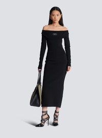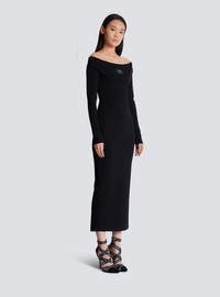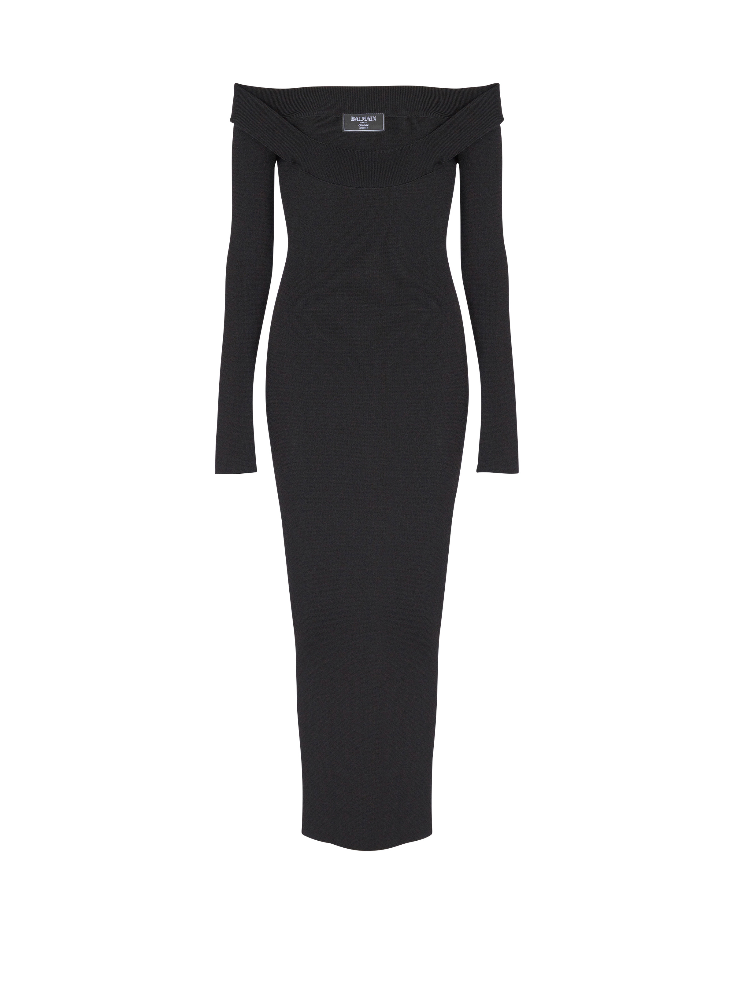 Plain knit dress - Long, slim fit - Boat neckline - Double neckline effect - Woven Balmain Couture label on the front - Long sleeves - Visible gold metal double zip fastening on the back with Balmain Paris-engraved sliders - Model measures 179cm and wears a size 36 - Main material: 80% viscose 15% polyester 5% polyamide - Made in France - Item: EF1RL109KH82100% of the viscose fibres used to make this garment come from certified, sustainably managed forests
