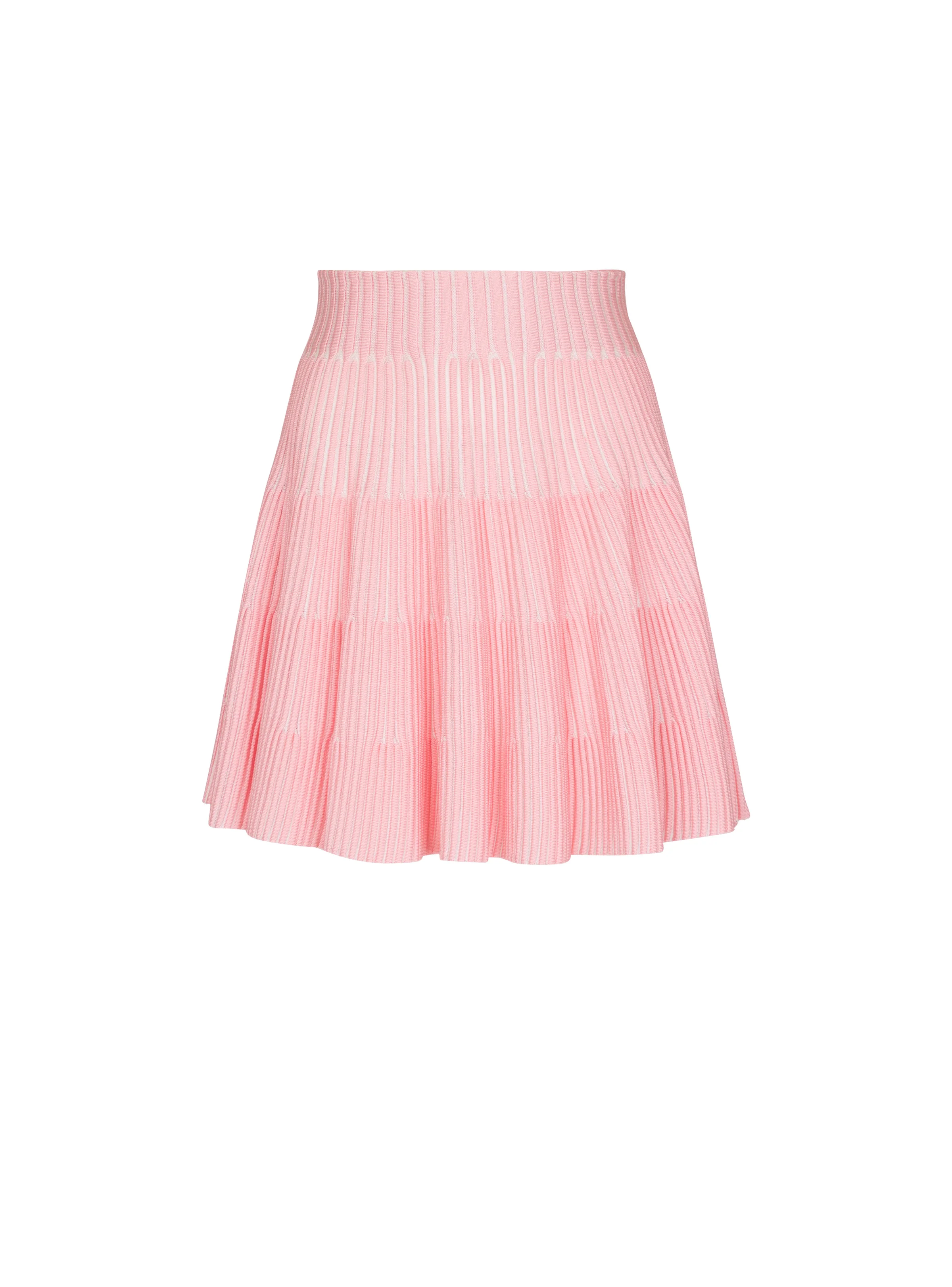Textured knit skirt - Reinforced waistband - Visible gold metal zip fastening on the back with Balmain Paris-engraved slider - Short, flared cut - Model measures 179cm and wears a size 36 - Main material: 83% viscose 15% polyester 2% polyamide - Made in Italy - Item: FF1LB512KI83
