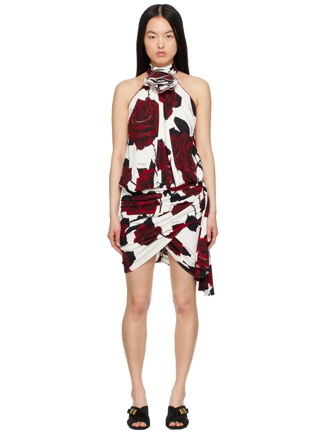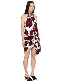 FSC®-certified viscose crepe dress. Draping, floral pattern, and logo pattern printed throughout. · Layered construction · Floral applique at stand collar · Ruching and gathering at asymmetric hem · Extended trim at side seam · Zip closure at racer back · Unlined Supplier color: Blanc/Rouge/Noir 100% viscose. Made in France 241251F052017