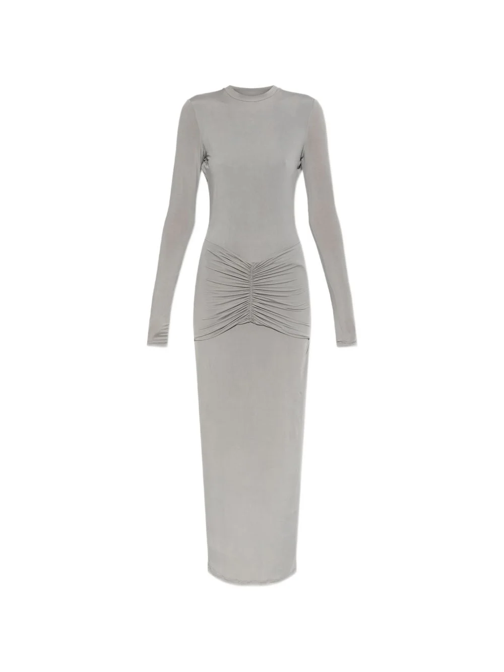 ruched open-back maxi dress Highlights - Grey - Long sleeves - Round neck - Open back - Gold-tone chain detail - Ruched detail Imported Composition Cupro 93%, Elastane 7% Washing instructions Read Manufacturer Guidelines