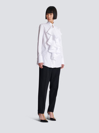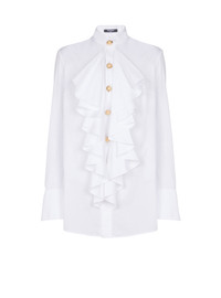 Ruffled poplin shirt - Officer collar - Front fastening with 7 buttons - Jabot-style ruffled trim fastening - Long sleeves - Straight cuffs with 3 buttons - Metal “Gold and Gold Coin” buttons - Rounded hem - Straight cut - Model measures 178cm and wears a size 36 - Main material: 100% cotton - Made in Italy - Item: FF1HR150CG22100% of the cotton fibres used to make this garment are certified and organically farmed