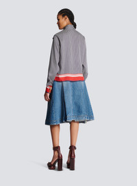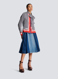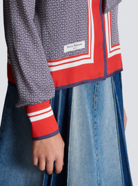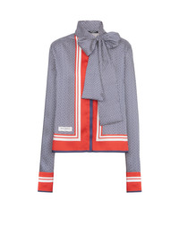 Shirt with pussy bow collar - Monogram-printed scarf - Contrasting plain-coloured edging - Relaxed, flowing fit and long sleeves - Tailored cuffs, 5 golden metal buttons - Invisible front fastening - Pierre Balmain label detail printed on the front - Model measures 176cm and wears a size 36 - Material: 100% recycled polyester - Made in Italy - Item: BF1HU125XG35