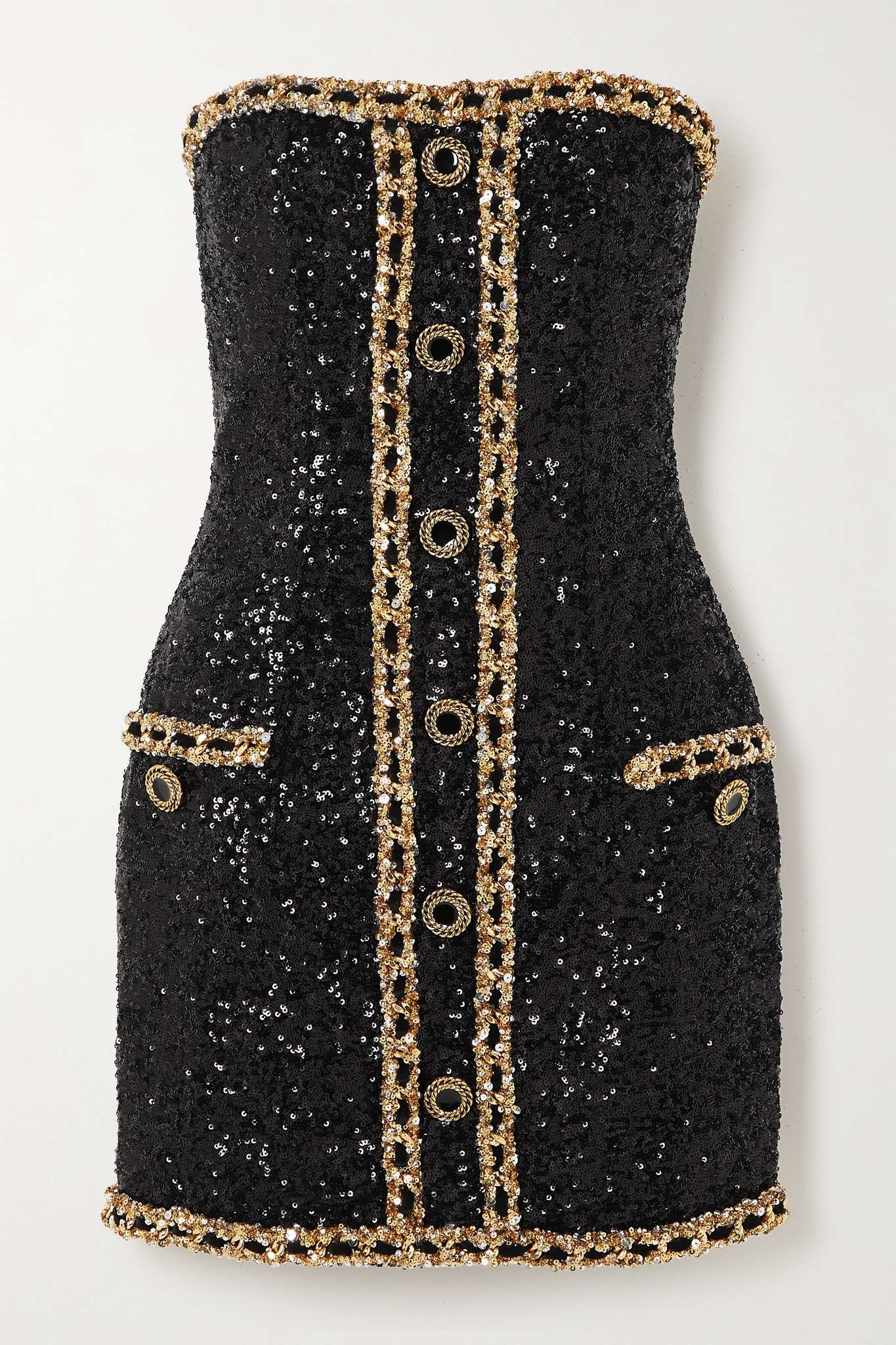 EDITORS'NOTES For those events when more is definitely more, you can't go wrong with sequins. Saturated at every inch - including the braided gold trims - Balmain's stretch-crepe dress will ensure all eyes are on you. Apply highlighter to your décolletage, arms and legs before going out for extra shimmer. SIZE & FIT - Fits true to size, take your normal size - Designed for a close fit - Internal bust support - Weighted, heavily embellished, slightly stretchy fabric - Model is 177cm/ 5'10" and is wearing a FR 36 DETAILS & CARE - Black sequined stretch-crepe - Zip fastening through back - 97% polyamide, 3% elastane - Dry clean