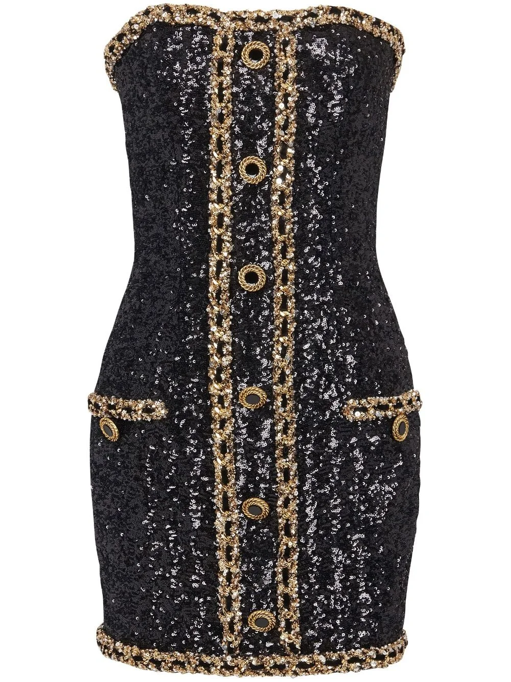 sequin-embellishment bustier minidress Highlights - Black - Sequin embellishment - Bustier-style neckline - Rear zip fastening - Decorative button detailing - Front patch pocket - Fitted waistline - Strapless - Straight hem Imported Composition Body: Polyamide 97%, Elastane 3% SIZE & FIT Measurement HIPS 33.07 in(84 cm) LENGTH 23.22 in(59 cm) WAIST 25.19 in(64 cm) BUST 28.34 in(72 cm)