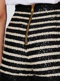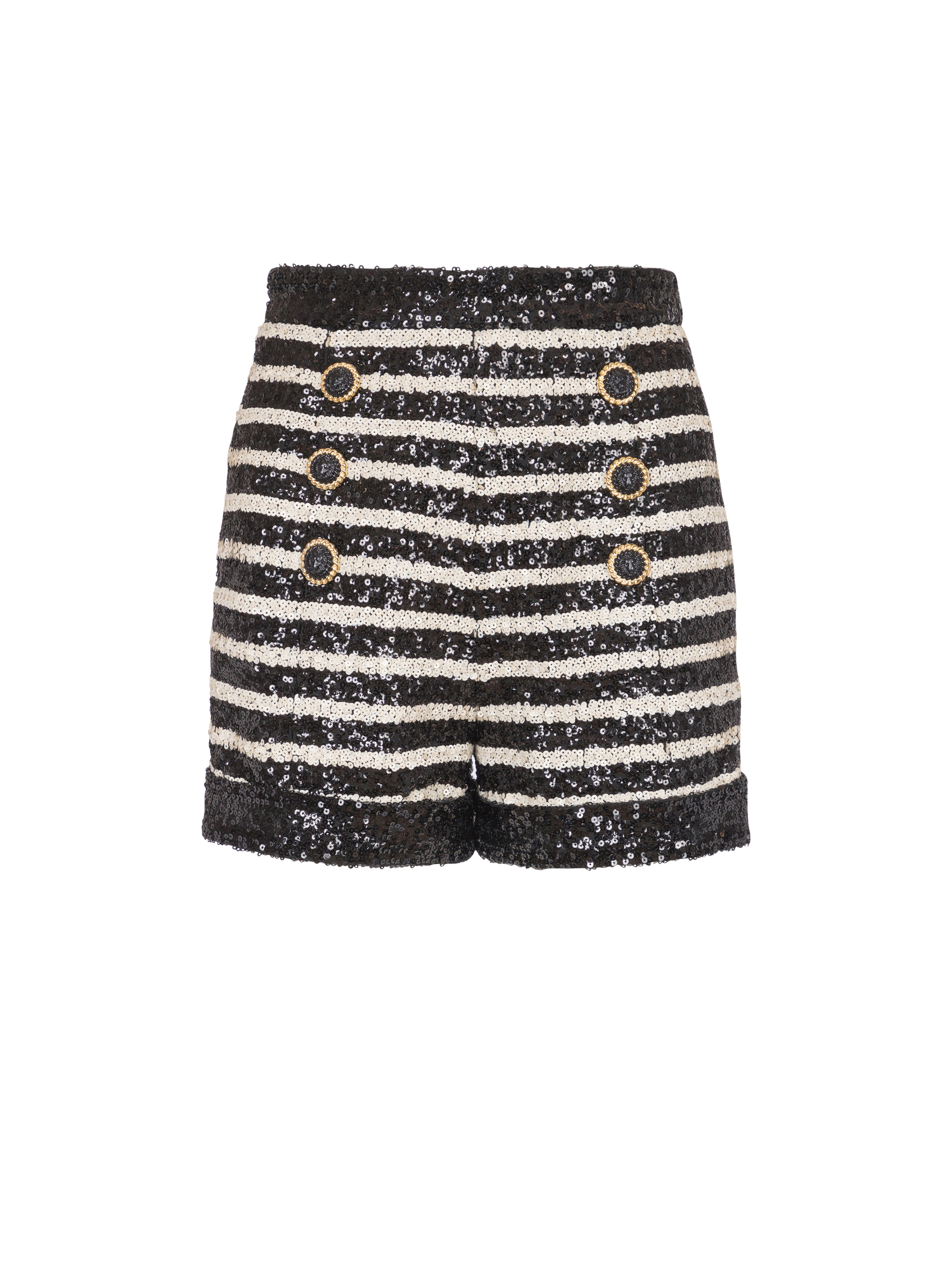 6-button striped shorts - High waist - 6 decorative two-tone "Double Chain Lion" buttons in gold and black metal on the front - Contrasting sequin trim - Back zip fastening - Model measures 179cm and wears a size 36 - Main material: 100% polyester - Made in Poland - Item: DF1PA265XJ31