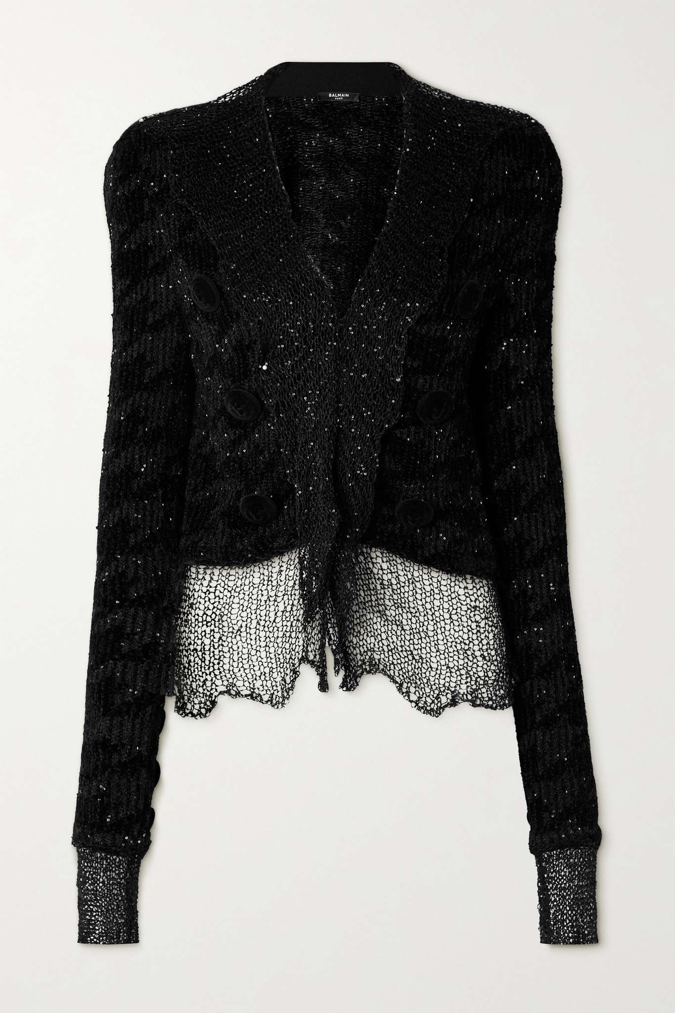 EDITORS'NOTES Balmain's jacket is sprinkled with sequins that shimmer prettily as they catch the light. Jacquard-knitted with a subtle black houndstooth pattern, it has padded shoulders that provide structure and sheer frayed trims at the cuffs and hem. Style it with the coordinating skirt and gold accessories. SIZE & FIT - Fits true to size, take your normal size - Tailored for a slim fit - Internal shoulder pads - Mid-weight, non-stretchy fabric - Model is 177cm/ 5'10" and is wearing a FR 36 DETAILS & CARE - Black jacquard-knit - Button fastenings through double-breasted front - 49% viscose, 31% polyamide, 20% polyester - Dry clean