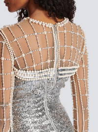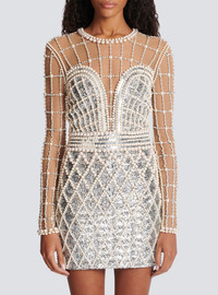 Short dress in embellished tulle - Pearl beads, crystals and silver sequins - Tight fit - Round neck, trompe l'oeil bustier - Long sleeves with invisible-zipped cuffs - Silver metal zip fastening at the back - Model measures 175cm and wears a size 36 - Material: 97% polyamide, 3% elastane - Made in France - Item: BF0R9338PC03
