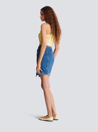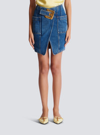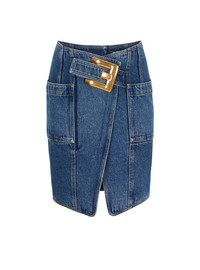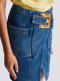 Short denim skirt with slit - Integrated belt with Anthem buckle - Patch pockets at the sides - Visible zip fastening on the back with Balmain Paris-engraved slider - Straight cut - Model measures 180cm and wears a size 36 - Main material: 100% cotton - Made in Romania - Item: GF1LBB28DG08100% of the cotton fibres used to make this garment are certified and organically farmed