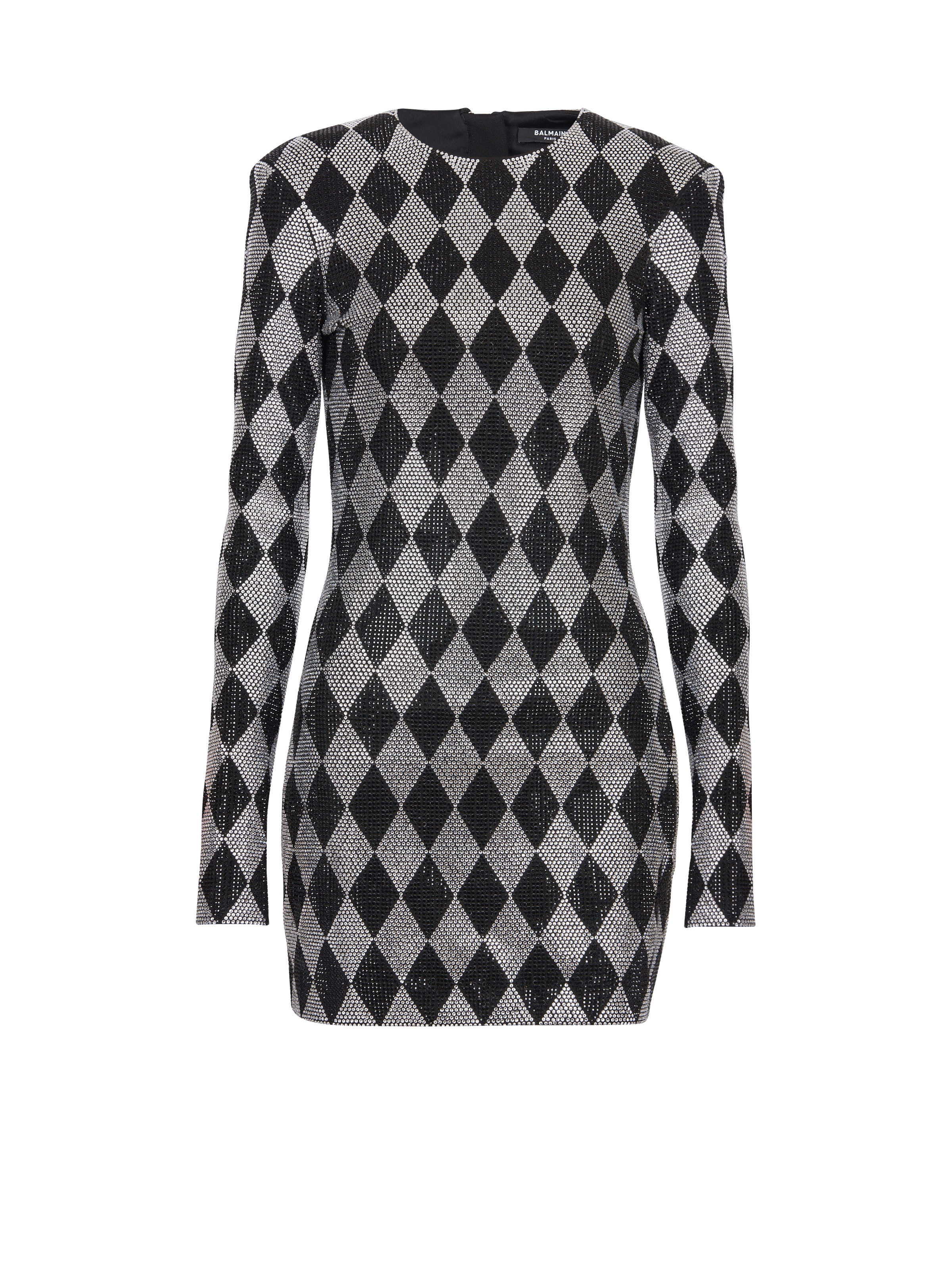 Short Diamond rhinestone dress - Short fitted cut - Round neckline - Structured shoulders - Long sleeves - Visible metal zip fastening on the back with Balmain-engraved slider - Fabric with two-tone rhinestones - Model measures 179cm and wears a size 36 - Main material: 96% silk 4% elastane - Made in Italy - Item: DF1R9343PC42