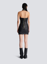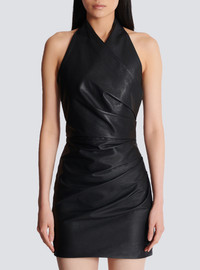 Draped leather halterneck dress - Short slim fit - Crossover V-neck - Fastening at the neck with 2 "Double Chain Lion" press studs in gold metal - Draped over the side - Visible gold metal zip fastening on the back with Balmain-engraved slider - Twill lining - Model measures 179cm and wears a size 36 - Main material: 100% lambskin - Made in Turkey - Item: EF1R3285LD71