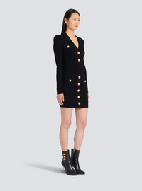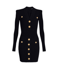 Short eco-designed knit dress with gold-tone buttons - Long sleeves - Openworked viscose - Embossed gold-tone buttons - Zip fastening on back - Fitted cut - Fits true to size - Select your usual size - The model is wearing FR size 36 - The model's height is 177 cm - Main material: 83% viscose, 17% Polyester - Made in Portugal - Item: DF1R8059KB07100% of the viscose fibers in this garment come from sustainably managed forests and certified
