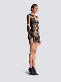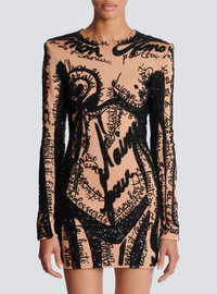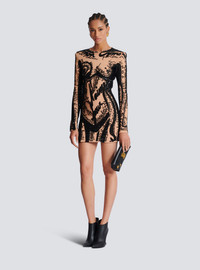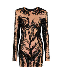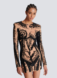 Embroidered dress with body motif - Short slim fit - Round neckline - Structured shoulders - Long sleeves with invisible-zipped cuffs - Bead and sequin embroidery - Plain sequin back - Visible metal zip fastening on the back with Balmain Paris-engraved slider - Satin lining - Model measures 179cm and wears a size 36 - Main material: 90% viscose 9% polyamide 1% elastane - Made in Slovakia - Item: EF1R9268PC72