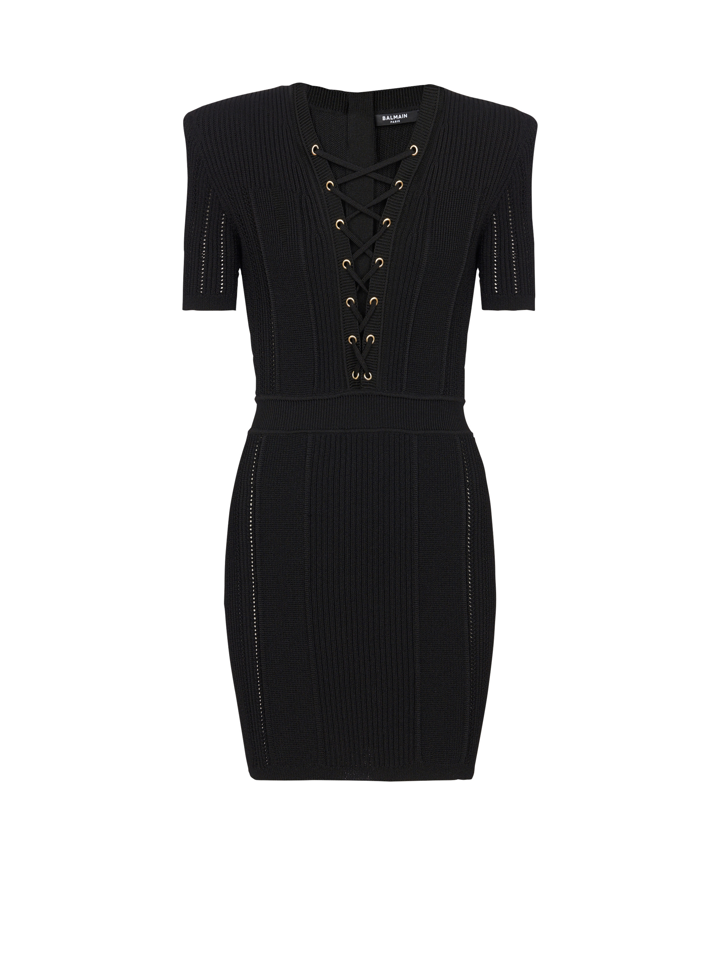 Fine ribbed knit laced dress - Short, fitted cut, nipped in waist - V-neck embellished with laced detail, golden metal eyelets - Structured shoulders, short sleeves - Fastening with golden metal zip at the back - Fine ribbed edging - Model measures 177cm and wears a size 36 - Main material: 84% viscose 16% polyester - Made in Italy - Item: CF1R6031KF24100% of the viscose fibres used to make this garment come from responsibly managed and FSC®-certified forests