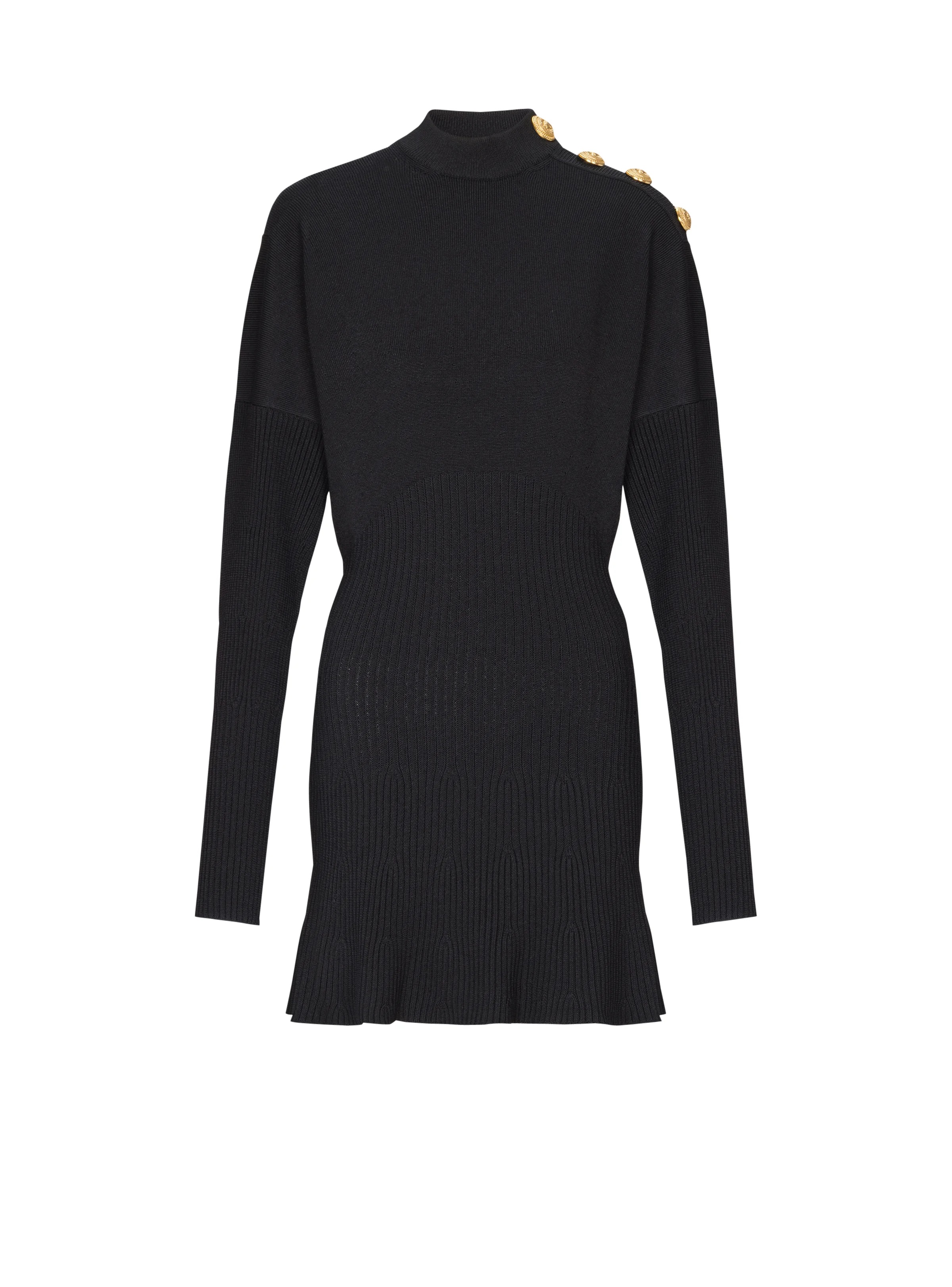 Short knit dress - High neck - Long batwing sleeves - 4 "Lion Head" buttons on the shoulder - Tube knit on the sleeves and skirt - Flared cut - Model measures 180cm and wears a size 36 - Main material: 84% viscose 16% polyester - Made in Italy - Item: GF1R9417KJ44100% of the viscose fibres used to make this garment come from certified, sustainably managed forests