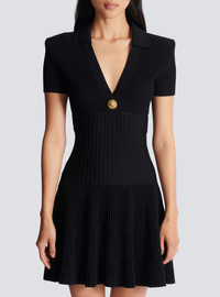 Short knit dress with tube details - V-shaped neckline with "Lion Head" button - Short sleeves - Large waist panel - Visible zip fastening on the back with Balmain Paris-engraved slider - Flared cut - Model measures 175cm and wears a size 36 - Main material: 85% viscose 15% polyester - Made in Italy - Item: GF1R7153KJ30100% of the viscose fibres used to make this garment come from certified, sustainably managed forests