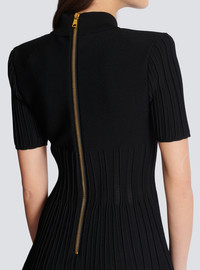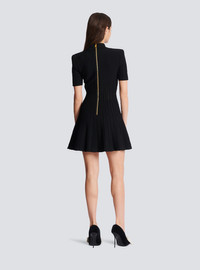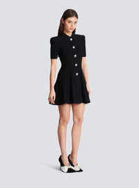 Short ribbed knit dress - Flared cut - Trompe-l'oeil shirt collar - 6 signature Lion buttons in silver metal - Marked waist - Short sleeves - Golden metal zip fastening at the back - Model measures 176cm and wears a size 36 - Main material: 88% viscose, 12% polyester - Made in Italy - Item: BF0R7150KF13 100% of the viscose fibres used to make this garment are recycled and RCS-certified