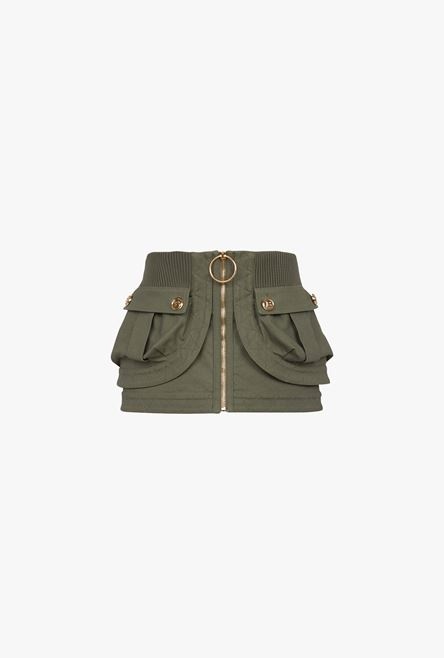 Khaki denim low-rise skirt Layered panels, gold-tone Balmain buttons along front, two side pockets, zip fastening on back ITEM INFORMATION - Fitted cut - The model is wearing FR size 36 - The model's height is 177 cm / 5'9 in, bust 83 cm / 32 in, waist 62 cm / 24 in, hips 89 cm / 35 in - Made in Italy - Material: 100% Cotton - Item: WF0LA115D1527AQ