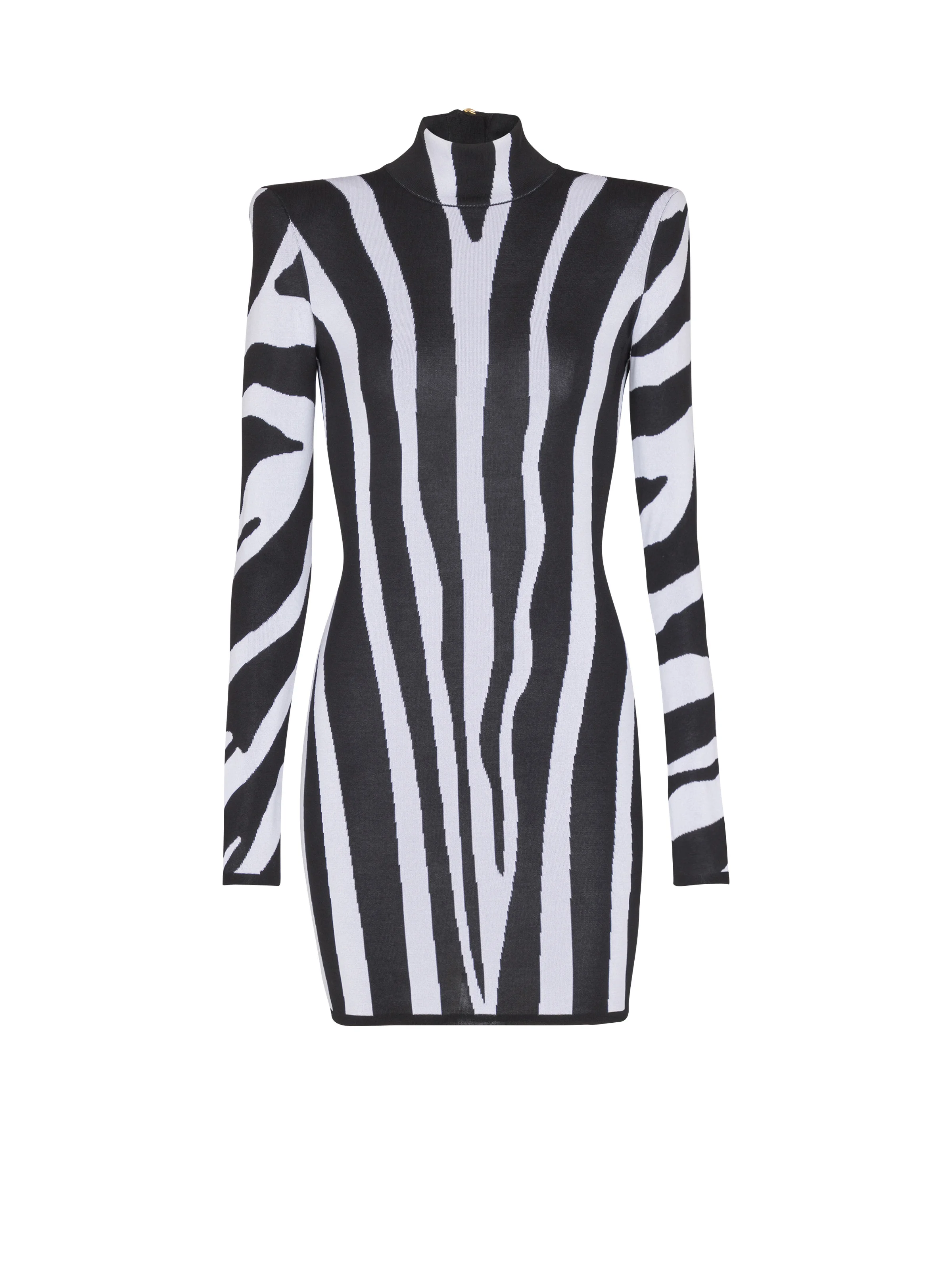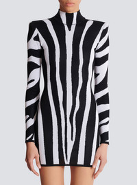 Short knit dress with zebra intarsia - High neck - Built-in shoulder pads - Long sleeves - Visible zip fastening on the back with Balmain Paris-engraved slider - Short fitted cut - Model measures 179cm and wears a size 34 - Main material: 88% viscose 12% polyester - Made in Italy - Item: FF0R8074KJ25100% of the viscose fibres used to make this garment come from certified, sustainably managed forests