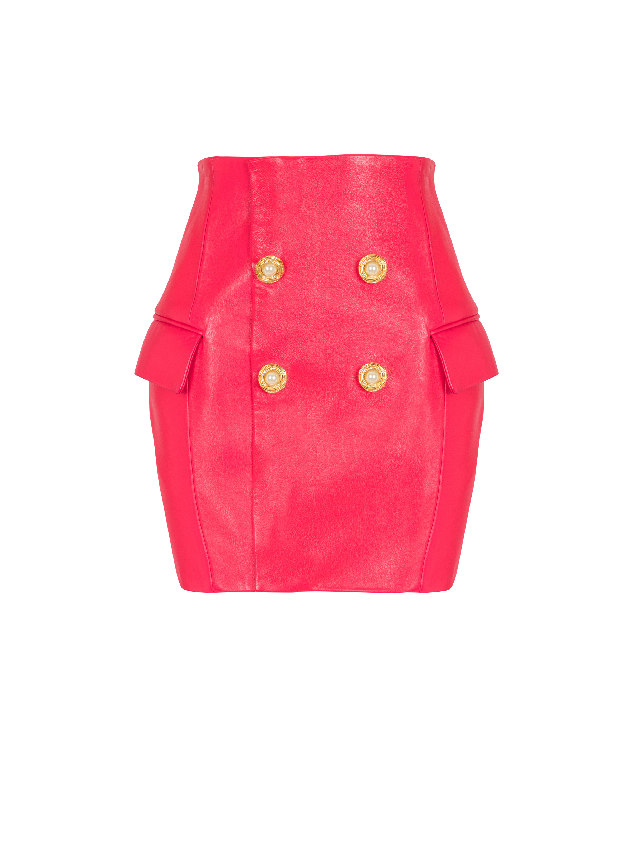 Lambskin skirt with buttons - 4 decorative "Gold Thread and Pearl" buttons in gold metal and pearl on the front - 2 side slash pockets with flaps - 2 slash pockets on the back - Visible gold metal zip fastening on the back with Balmain Paris-engraved slider - Twill lining - Short, tight, high-waisted fit - Model measures 178cm and wears a size 36 - Main material: 100% lambskin - Made in Turkey - Item: EF0LBA82LC62