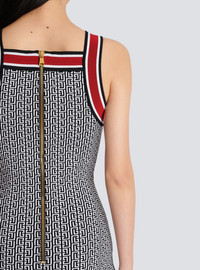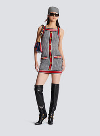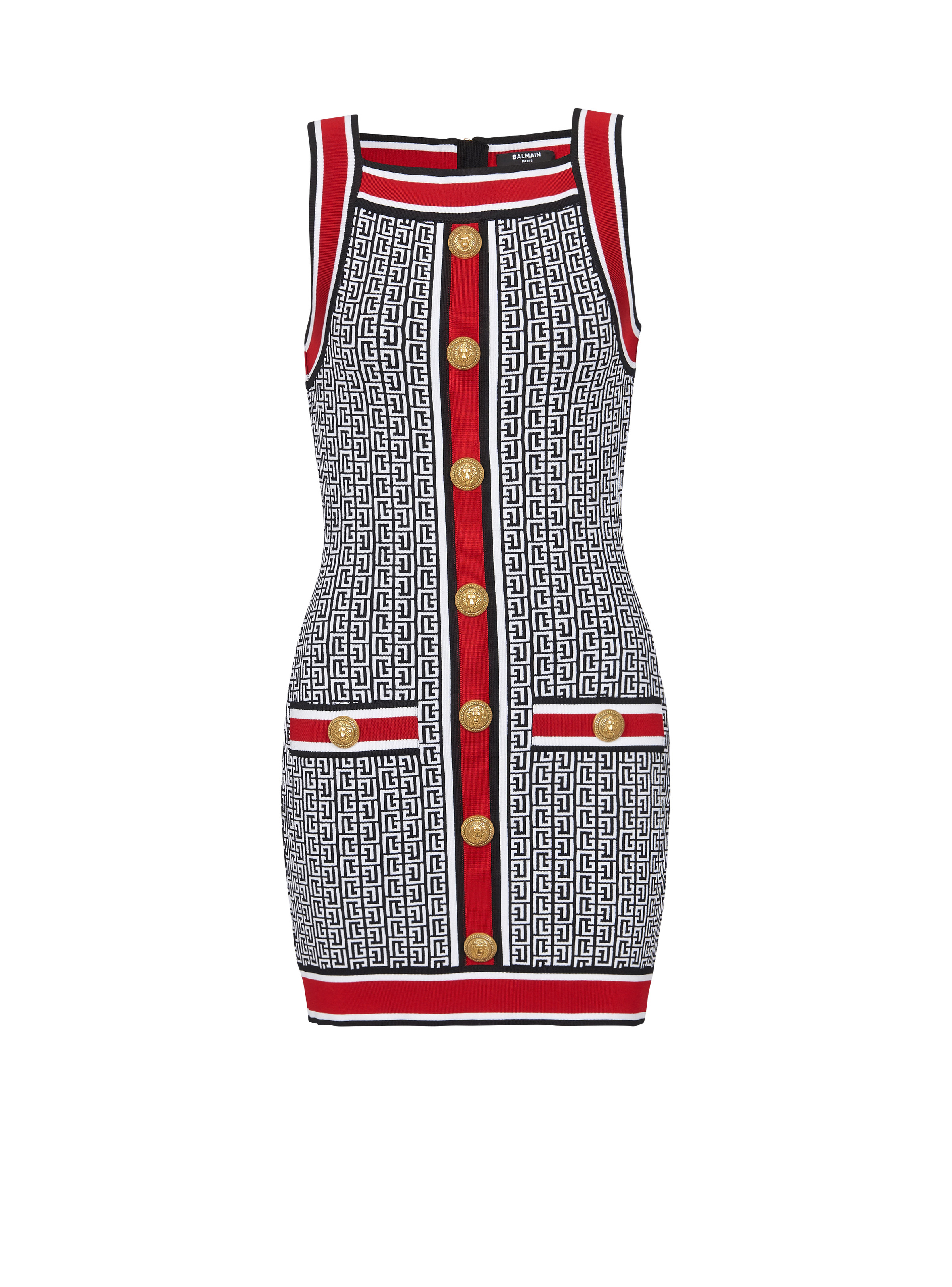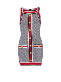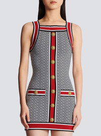 Fine knit dress with contrasting monogram detail - Tight fit - Sleeveless, square neckline - 7 decorative golden metal 'Lion Head' buttons - 2 trompe l'oeil pockets - Ribbed edging with contrasting stripes - Golden zip fastening at the back - Model measures 180cm and wears a size 36 - Material: 88% viscose from sustainably managed forests, 10% polyester, 2% polyamide - Made in France - Item: BF1R4034KE89