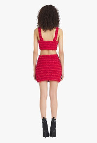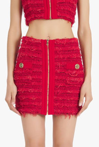 High-waisted short red tweed skirt High waist, two flat pockets with gold-tone Balmain buttons, zip fastening in back ITEM INFORMATION - Fitted cut - The model is wearing FR size 36 - The model's height is 177 cm / 5'9 in, bust 81 cm / 32 in, waist 58 cm / 23 in, hips 89 cm / 35 in - Made in France - Material: 55% Viscose, 20% Polyamide, 16% Acrylic, 7% Polyurethane, 2% Virgin wool - Item: WF0LB012K3363BZ