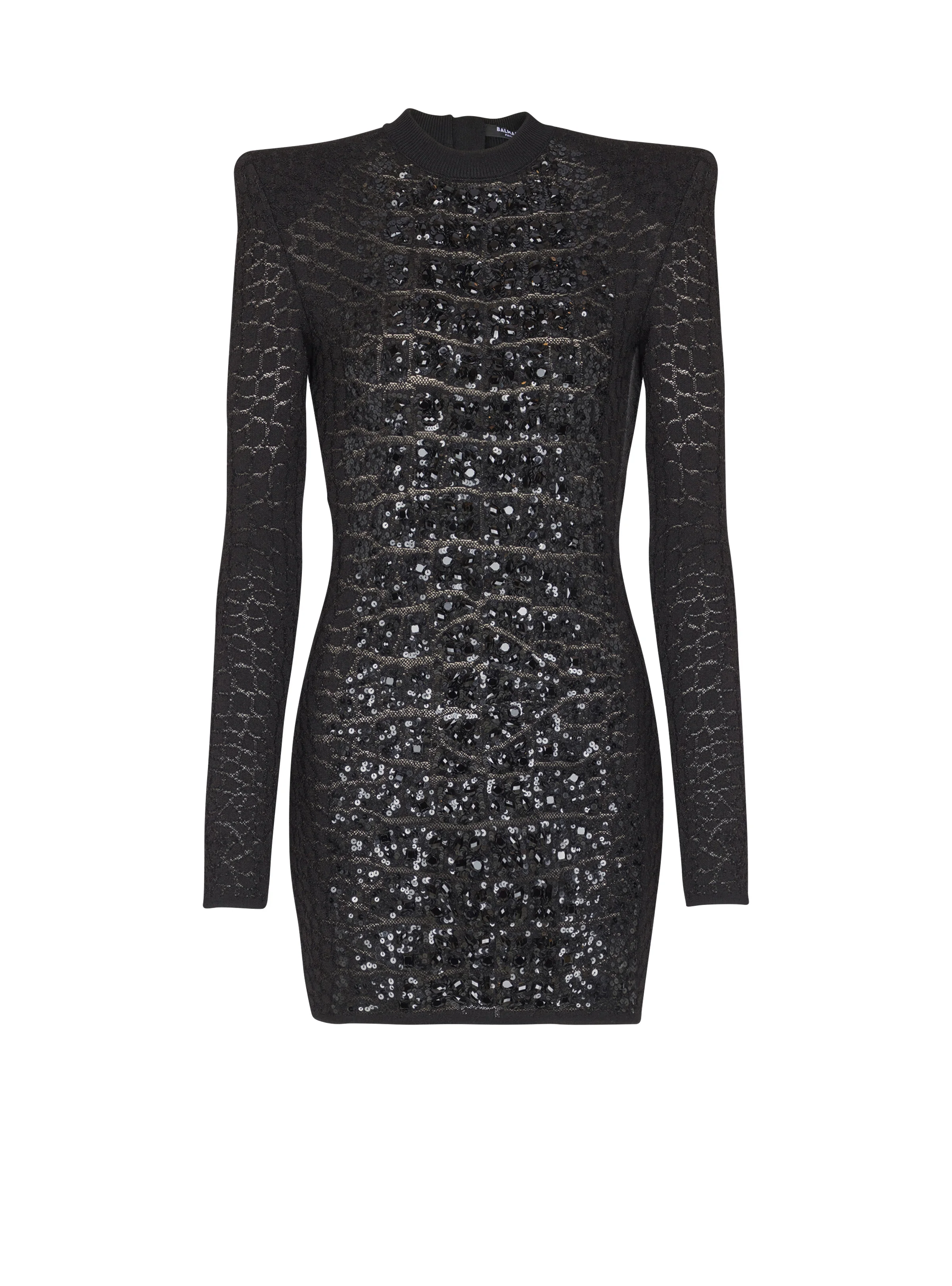 Short sequin dress in crocodile knit - Rounded crew neckline - Long sleeves - Visible zip fastening with Balmain Paris-engraved slider - Fitted cut and sheer details - Model measures 180cm and wears a size 36 - Main material: 80% viscose 12% polyester 7% polyamide 1% elastane - Made in France - Item: FF0R801297KI100% of the viscose fibres used to make this garment come from certified, sustainably managed forests