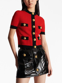 short-sleeve cropped cardigan Highlights - Black/red - Knitted construction - Slip pockets to the sides - Embossed gold-tone buttons - Front button fastening - Contrasting trim - Round neck - Short sleeves - Straight hem Made in Italy Composition Body: Viscose 83%, Polyester 17% SIZE & FIT Measurement SLEEVE LENGTH 8.66 in(22 cm) LENGTH 18.5 in(47 cm)