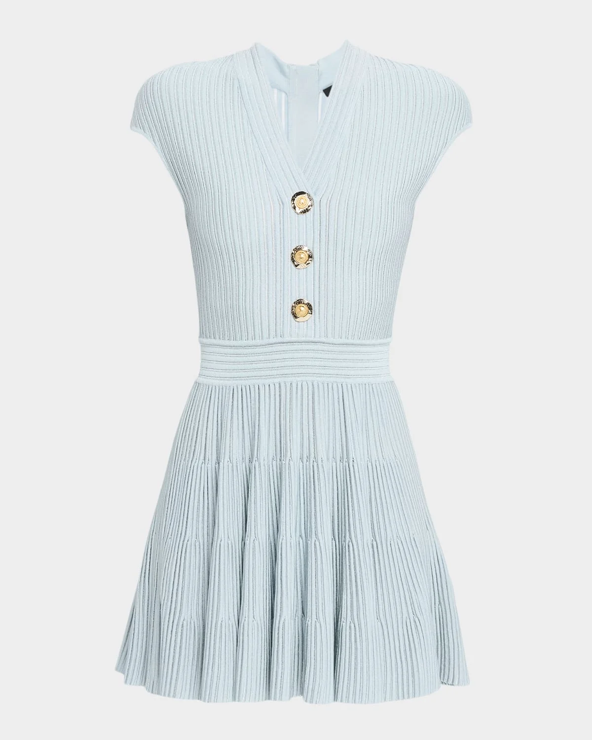 - Balmain flechage knit dress featuring goldtone novelty buttons and a tiered skirt - V neckline - Short sleeves - Fit-and-flare silhouette - Mini length - Back zip - Nylon/polyamide/polyester - Professional cleaning recommended - Made in Italy