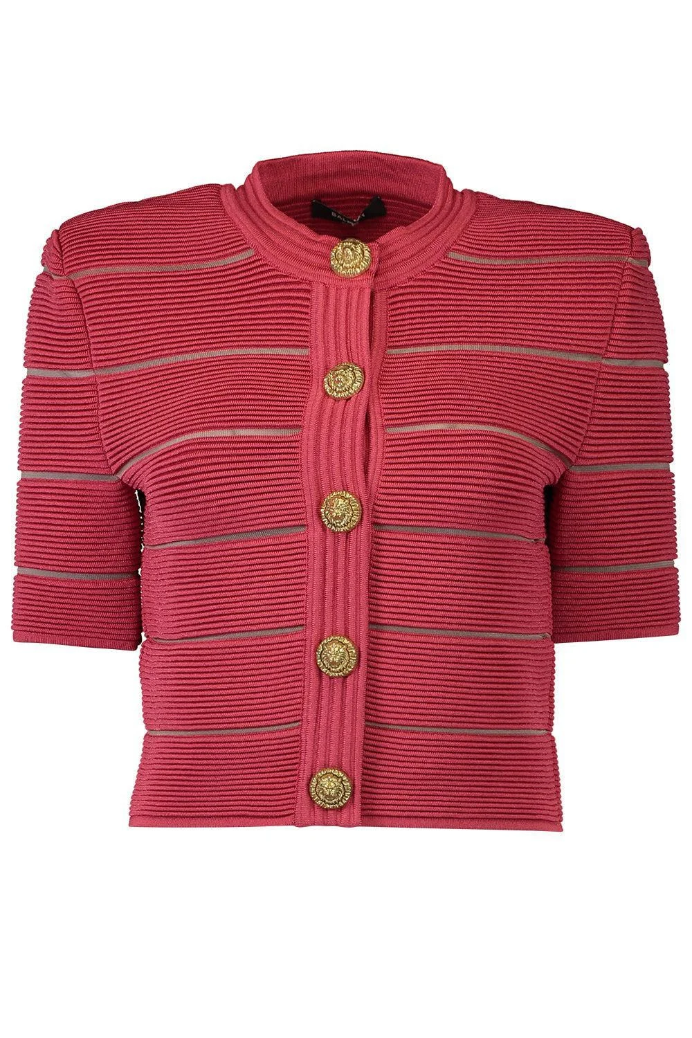 DETAILS AND INSIGHT Balmain short sleeve stripe cardigan in rouge carmin. 77% Viscose, 14% Polyester, 8% Polyamide, 1% Elastane Professional Clean Made In Italy Style GF0KL285KJ75-3GS