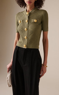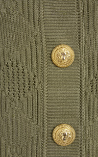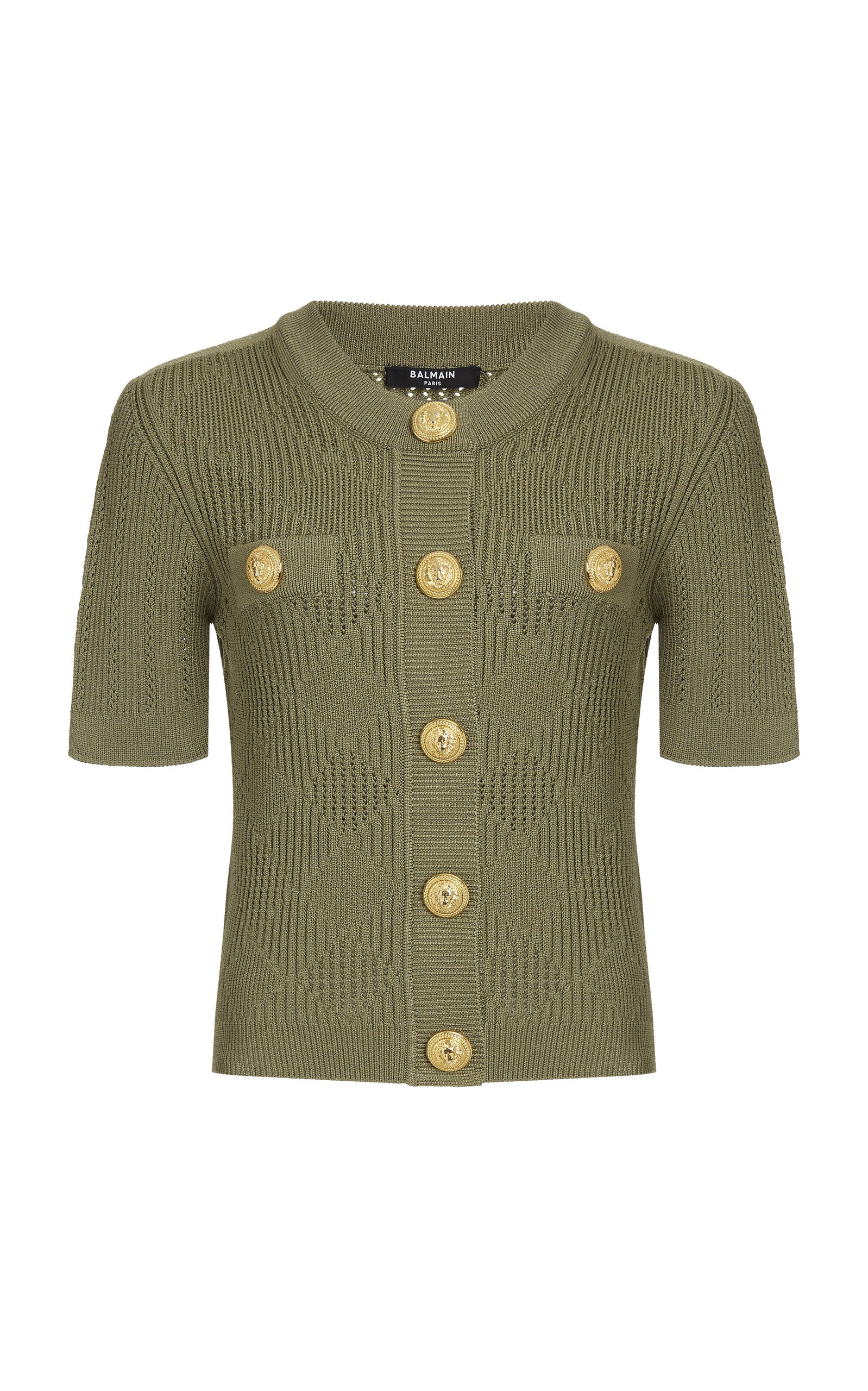 Fall '24 combines the bold architectural lines and precise tailoring of Pierre Balmain’s “New French Style” with the graceful dignity of Bordeaux—resulting in a collection that reflects the timeless style of savvy French women of all ages. This short sleeve cardigan is spun with a vichy-knit texture and detailed with signature gold shank buttons. PRODUCT DETAILS - Fall/Winter '24 - Button fastening through front - Composition: 84% Viscose, 16% Polyester - Dry clean - Imported SIZE & FIT - Designed for a slim fit