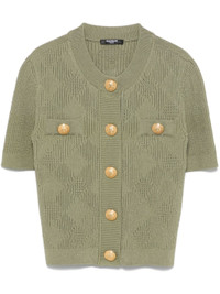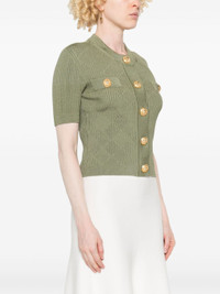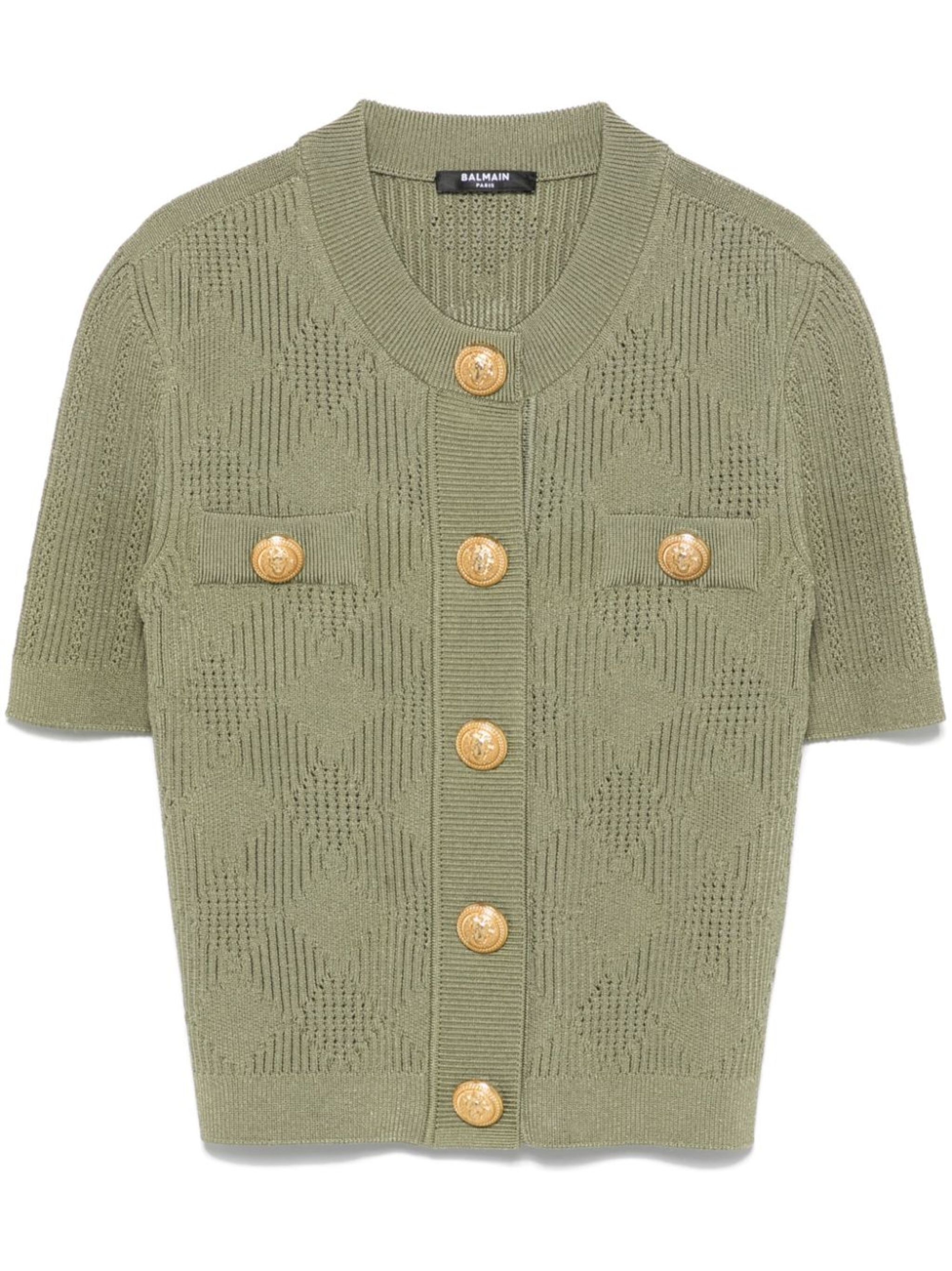 olive green knitted construction front press-stud fastening embossed gold-tone buttons crew neck short sleeves faux pocket detail ribbed cuffs and hem unlined Size & Fit Model Measurements: Height: 1.75 m Bust/Chest: 86.0 cm Hips: 92.0 cm Waist: 66.0 cm Model wears size 36 Fabric and Care Designer Style ID: DF0KL028HK60 Designer Colour: 7CO Composition: Viscose 84%, Polyester 16% Washing instructions: Specialist Cleaning Made in Italy