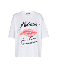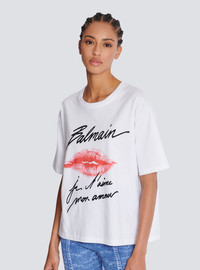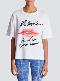 Balmain Letters T-shirt with Kiss print - Round neck with ribbed trim - Short sleeves - Contrasting flocked Balmain logo and "Je t'aime mon amour" lettering on the front - Contrasting Kiss motif printed on the front - Woven Balmain Couture label on the back - Regular fit - Model measures 179cm and wears a size S - Main material: 100% cotton - Made in Portugal - Item: EF1EG110GE45100% of the cotton fibres used to make this garment are certified and organically farmed