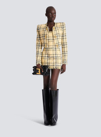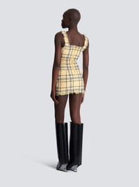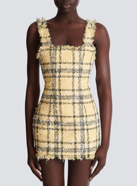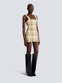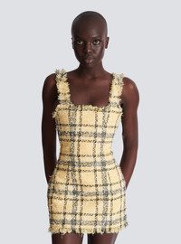 Short glitter tweed dress - Straight neckline with straps - Frayed edging - Visible zip fastening on the back with Balmain Paris-engraved slider - Fitted cut - Model measures 177cm and wears a size 36 - Main material: 52% polyester 28% polyamide 20% cotton - Made in Bulgaria - Item: GF1R2540XL73