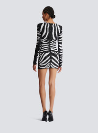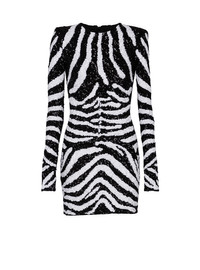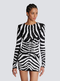 Short two-tone zebra sequin dress - Fitted cut - Round neckline - Structured shoulders - Long sleeves with invisible zips - Visible metal zip fastening on the back - Balmain-engraved slider - Satin lining - Model measures 179cm and wears a size 36 - Main material: 66% polyamide 34% elastane - Made in India - Item: DFAR9344PC52