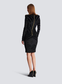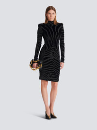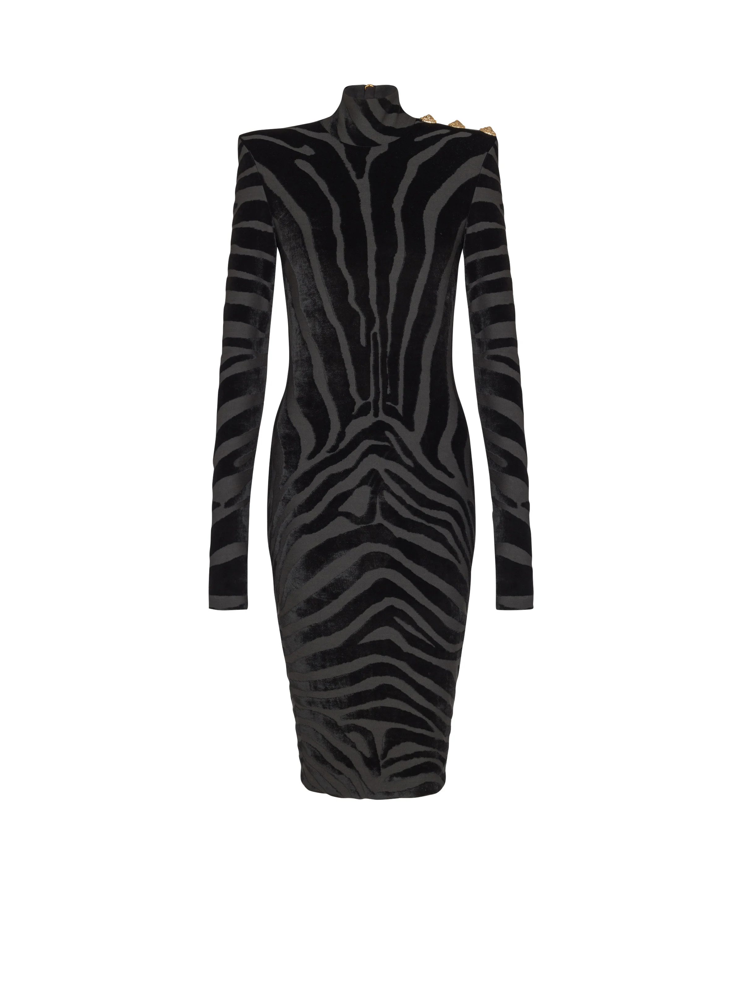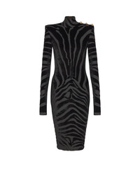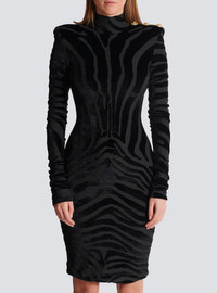 Short zebra-print velvet dress - High neck - Built-in shoulder pads - 3 gold metal "Lion Head" buttons on the shoulders - Long sleeves - Visible zip fastening on the back with Balmain Paris-engraved slider - Lined - Fitted cut - Model measures 180cm and wears a size 36 - Main material: 70% viscose 30% polyester - Made in Bulgaria - Item: FF0RF075JL11