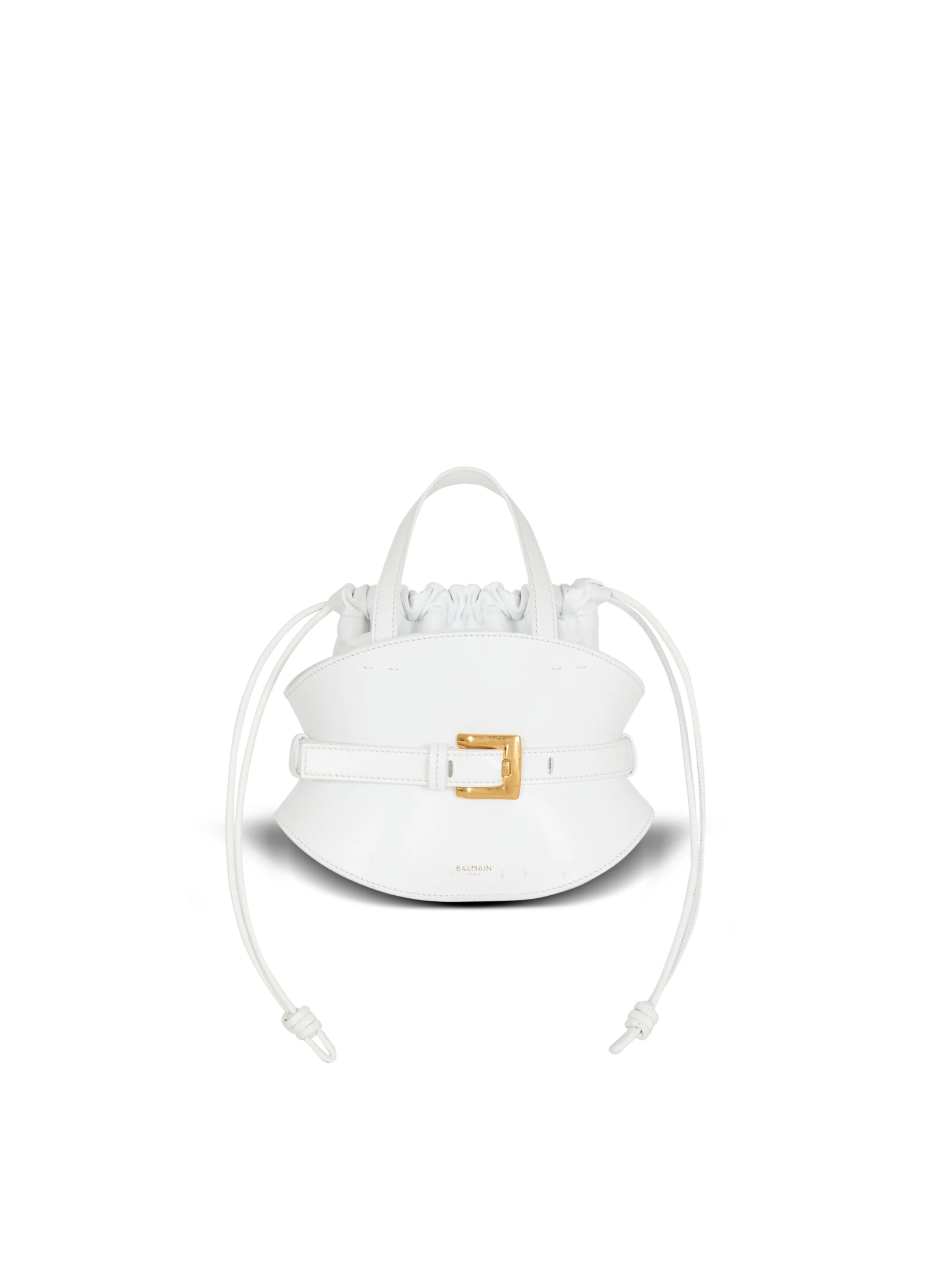 Shuffle Mini bag in calfskin leather - Belted style - Carry in the hand, on the shoulder or across the body - Adjustable and detachable leather shoulder strap with stud buttons - Leather handles - Belt with metal PB-engraved buckle - Embossed gold Balmain Paris logo on the front - Inside bag with drawstring ties - Fastening with adjustable leather tie - Leather lining - Gold hardware - Dimensions: 10 x 23 x 13 cm - Main material: 100% calfskin - Made in Italy - Item: FN0DP017LMTE