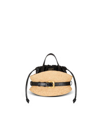 Shuffle Mini bag in raffia - Belted style - Carry in the hand, on the shoulder or across the body - Adjustable and detachable leather shoulder strap with stud button - Leather handles - Belt with metal PB-engraved buckle - Balmain Paris-embossed faux leather inside bag with drawstring ties - Fastening with adjustable ties - Gold hardware - Dimensions: 10 x 23 x 13 cm - Main material: 100% raffia - Made in Italy - Item: FN1DP017TRBO