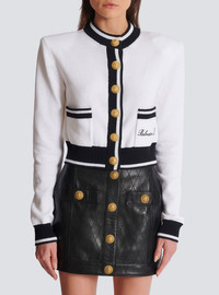 Balmain Signature knit cardigan - Straight cut - Structured shoulders - Long sleeves - Round neckline - Fastening with 6 "Double Chain Lion" buttons in gold metal - 2 patch pockets - Balmain Signature logo embroidered on the front - Striped contrasting ribbed edging - Model measures 180cm and wears a size 36 - Main material: 43% lyocell 43% cotton 14% polyamide - Made in Italy - Item: DF1KL133KG48