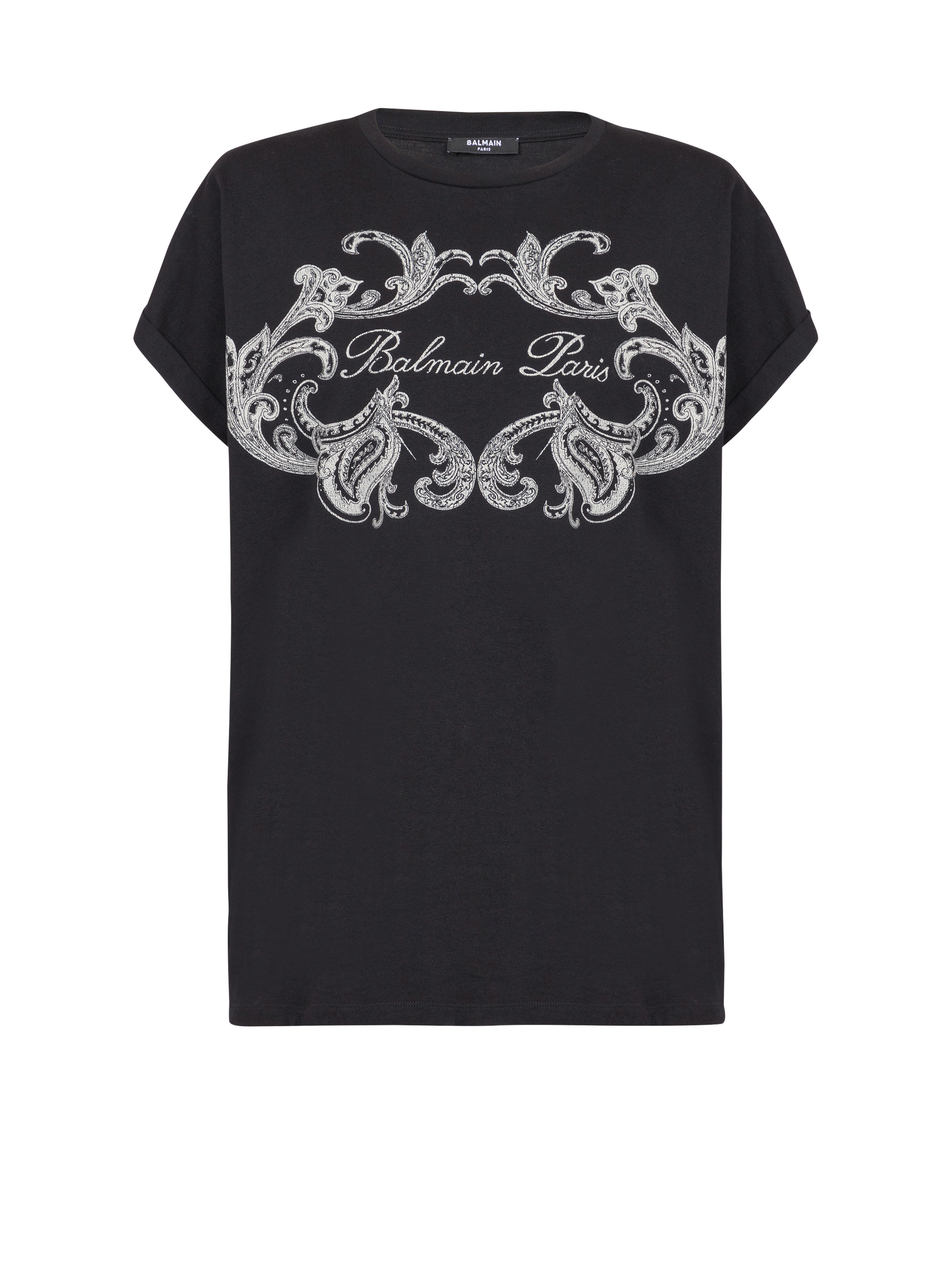 Balmain Signature paisley print T-shirt - Balmain Signature logo and contrasting paisley print on the front - Straight cut - Round neck - Cuffed sleeves - Model measures 179cm and wears a size S - Main material: 100% cotton - Made in Italy - Item: CF1EF010GD30100% of the cotton fibres used to make this garment are organically farmed and GOTS-certified