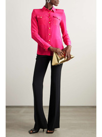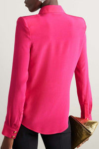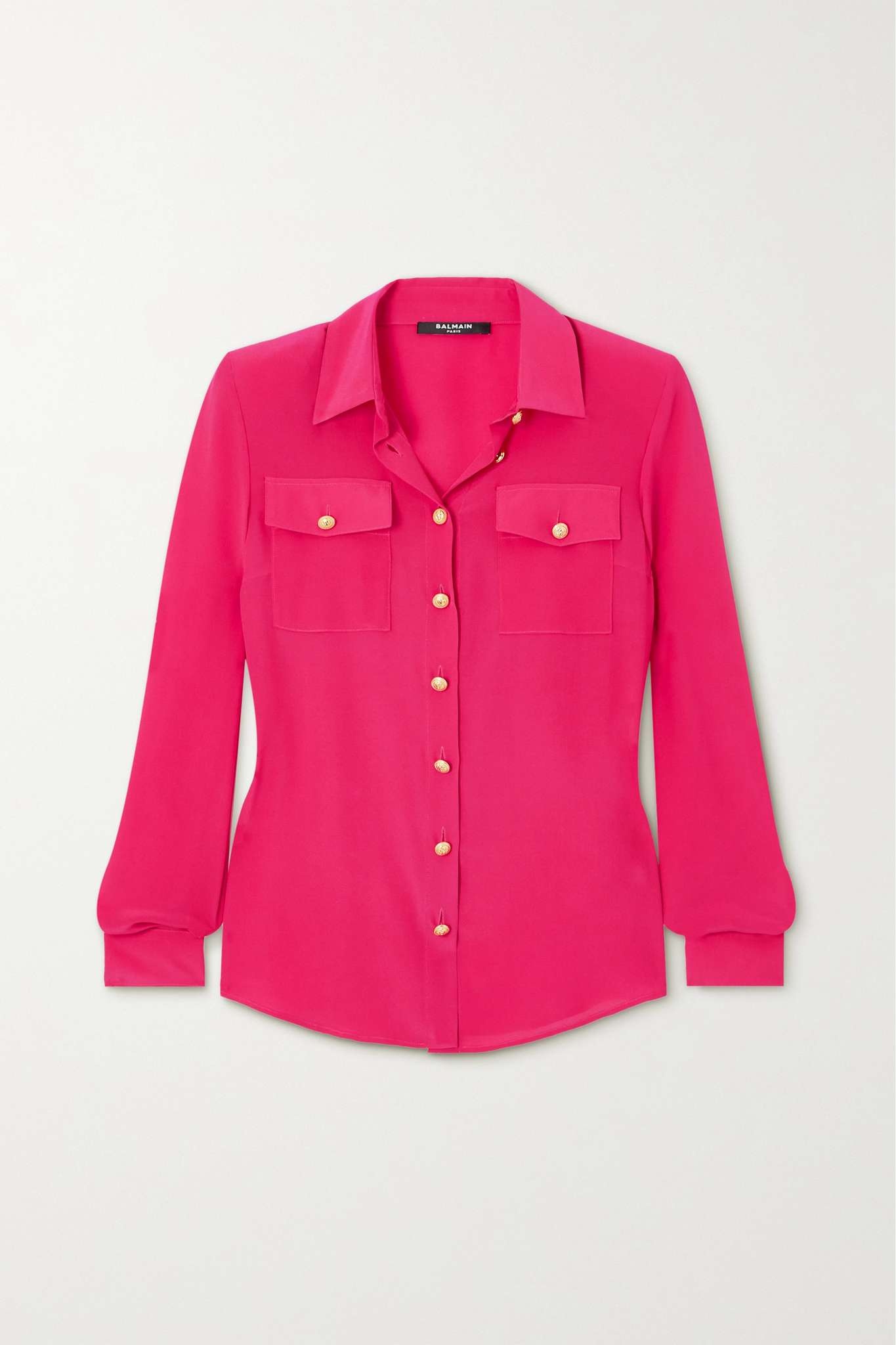 EDITORS'NOTES Balmain's shirt features the label's signature gold-tone crested buttons along the placket and front pockets. It's cut for a slightly loose fit from silk crepe de chine and has internal shoulder pads for structure. Tuck yours into everything from tailoring to denim. SIZE & FIT - Fits true to size, take your normal size - Designed for a slightly loose fit - Internal shoulder pads - Lightweight, non-stretchy fabric - Model is 177cm/ 5'10" and is wearing a FR 36 DETAILS & CARE - Fuchsia silk crepe de chine - Button fastenings through front - 100% silk - Machine wash